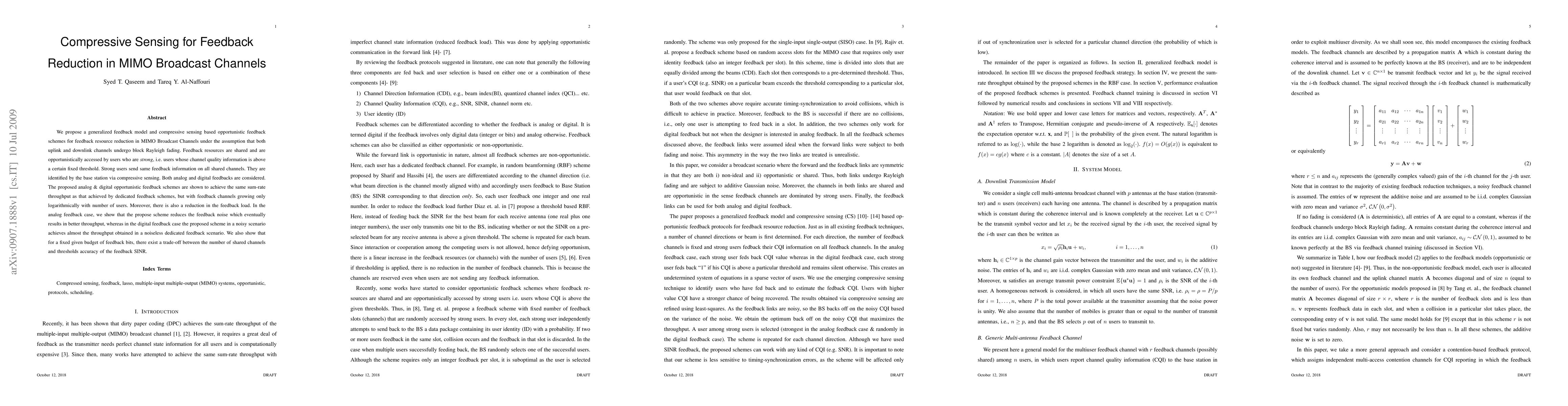 This paper proposes compressive sensing-based opportunistic feedback schemes for reducing feedback resources in MIMO broadcast channels, achieving similar sum-rate throughput as dedicated feedback while requiring feedback channels that grow logarithmically with the number of users. The schemes also reduce feedback load and noise, maintaining performance under noisy conditions.