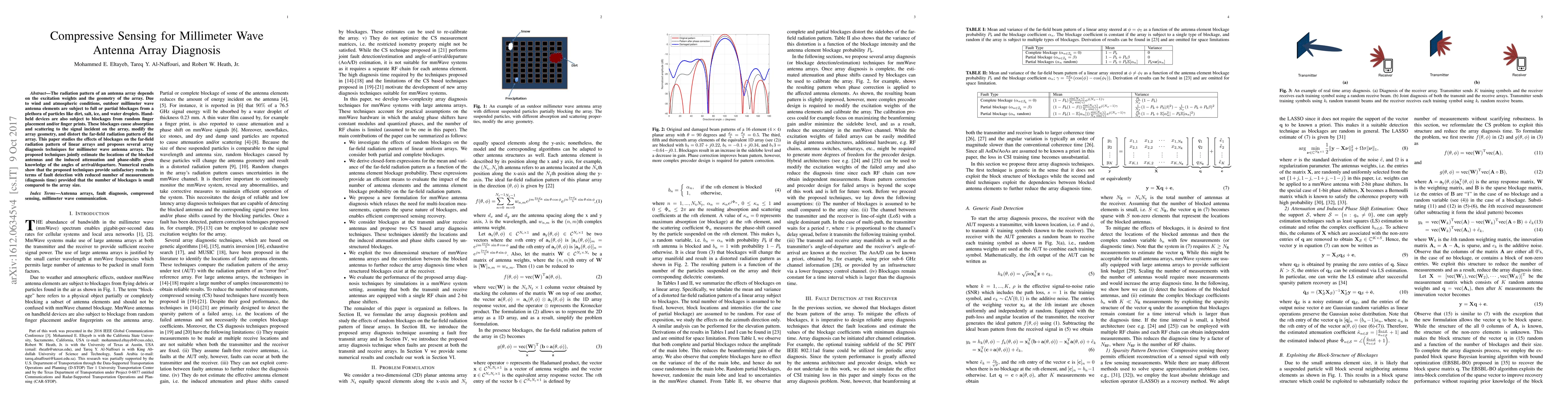 The radiation pattern of an antenna array depends on the excitation weights and the geometry of the array. Due to wind and atmospheric conditions, outdoor millimeter wave antenna elements are subject to full or partial blockages from a plethora of particles like dirt, salt, ice, and water droplets. Handheld devices are also subject to blockages from random finger placement and/or finger prints. These blockages cause absorption and scattering to the signal incident on the array, and change the array geometry. This distorts the far-field radiation pattern of the array leading to an increase in the sidelobe level and decrease in gain. This paper studies the effects of blockages on the far-field radiation pattern of linear arrays and proposes two array diagnosis techniques for millimeter wave antenna arrays. The proposed techniques jointly estimate the locations of the blocked antennas and the induced attenuation and phase shifts. Numerical results show that the proposed techniques provide satisfactory results in terms of fault detection with reduced number of measurements (diagnosis time) provided that the number of blockages is small compared to the array size.