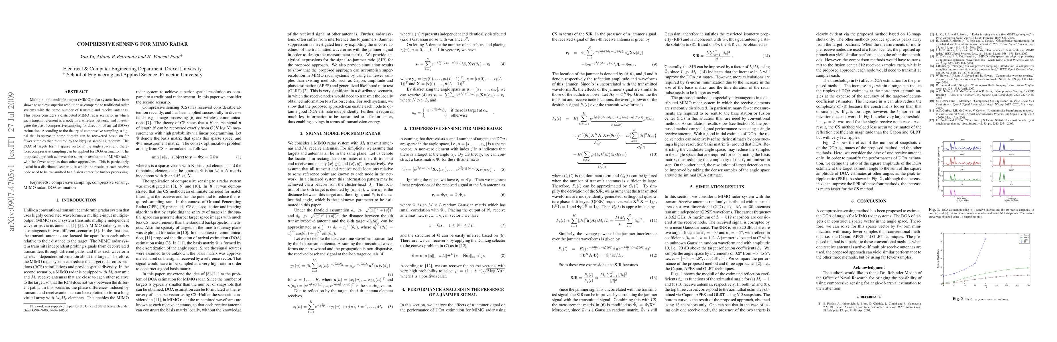 Multiple-input multiple-output (MIMO) radar systems have been shown to achieve superior resolution as compared to traditional radar systems with the same number of transmit and receive antennas. This paper considers a distributed MIMO radar scenario, in which each transmit element is a node in a wireless network, and investigates the use of compressive sampling for direction-of-arrival (DOA) estimation. According to the theory of compressive sampling, a signal that is sparse in some domain can be recovered based on far fewer samples than required by the Nyquist sampling theorem. The DOA of targets form a sparse vector in the angle space, and therefore, compressive sampling can be applied for DOA estimation. The proposed approach achieves the superior resolution of MIMO radar with far fewer samples than other approaches. This is particularly useful in a distributed scenario, in which the results at each receive node need to be transmitted to a fusion center for further processing.