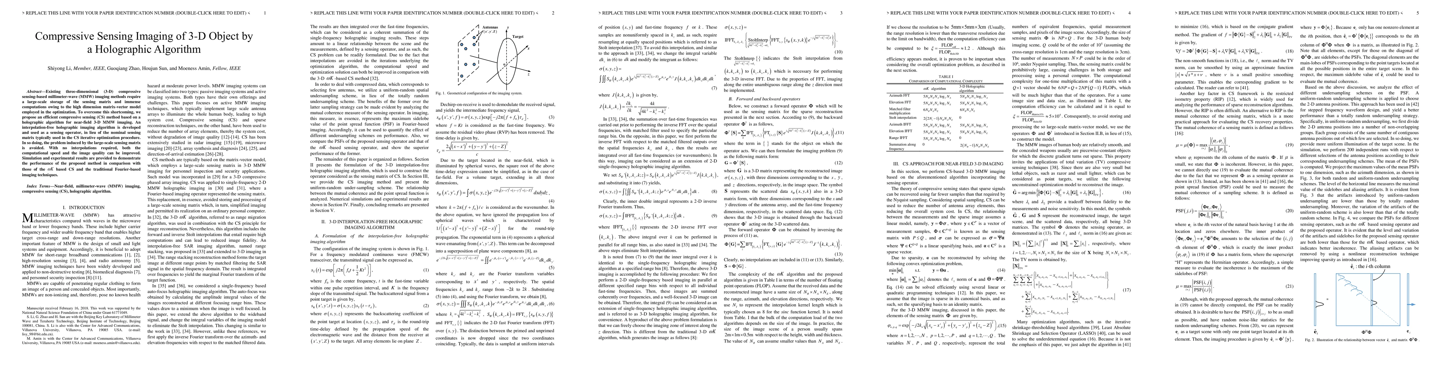 This paper proposes an efficient compressive sensing method using a holographic algorithm for near-field 3-D millimeter-wave imaging, avoiding large-scale sensing matrices and improving computational speed and image quality without interpolation. Simulation and experimental results show superior performance compared to Omega-K based CS and traditional Fourier-based imaging techniques.