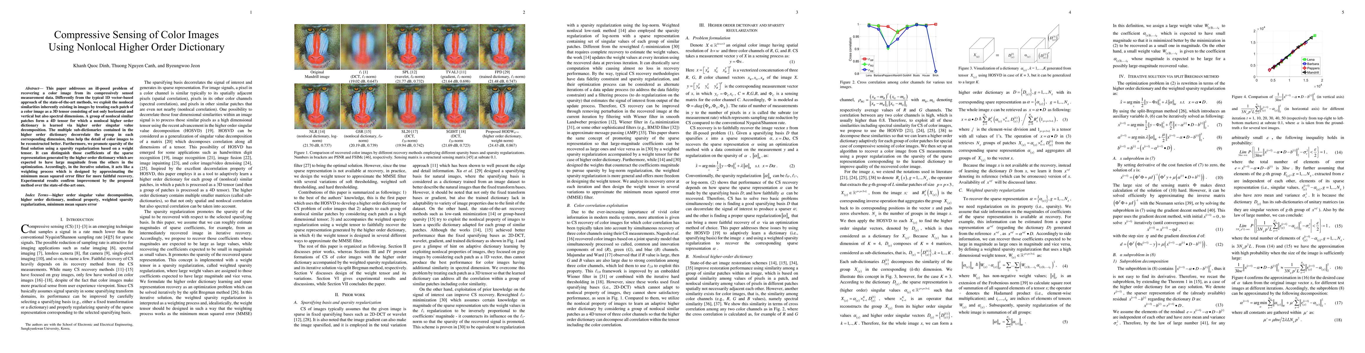 This paper addresses an ill-posed problem of recovering a color image from its compressively sensed measurement data. Differently from the typical 1D vector-based approach of the state-of-the-art methods, we exploit the nonlocal similarities inherently existing in images by treating each patch of a color image as a 3D tensor consisting of not only horizontal and vertical but also spectral dimensions. A group of nonlocal similar patches form a 4D tensor for which a nonlocal higher order dictionary is learned via higher order singular value decomposition. The multiple sub-dictionaries contained in the higher order dictionary decorrelate the group in each corresponding dimension, thus help the detail of color images to be reconstructed better. Furthermore, we promote sparsity of the final solution using a sparsity regularization based on a weight tensor. It can distinguish those coefficients of the sparse representation generated by the higher order dictionary which are expected to have large magnitude from the others in the optimization. Accordingly, in the iterative solution, it acts like a weighting process which is designed by approximating the minimum mean squared error filter for more faithful recovery. Experimental results confirm improvement by the proposed method over the state-of-the-art ones.