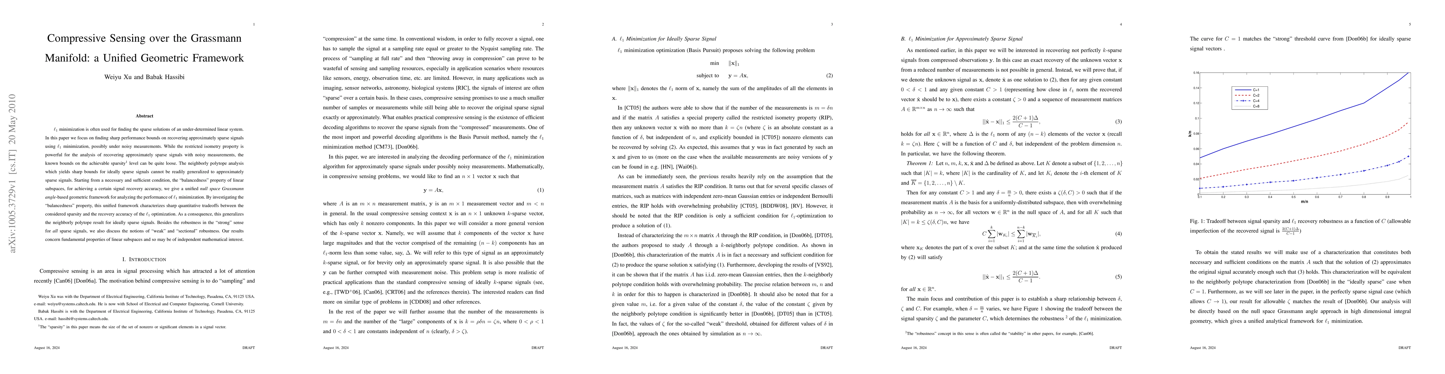 $\ell_1$ minimization is often used for finding the sparse solutions of an under-determined linear system. In this paper we focus on finding sharp performance bounds on recovering approximately sparse signals using $\ell_1$ minimization, possibly under noisy measurements. While the restricted isometry property is powerful for the analysis of recovering approximately sparse signals with noisy measurements, the known bounds on the achievable sparsity (The "sparsity" in this paper means the size of the set of nonzero or significant elements in a signal vector.) level can be quite loose. The neighborly polytope analysis which yields sharp bounds for ideally sparse signals cannot be readily generalized to approximately sparse signals. Starting from a necessary and sufficient condition, the "balancedness" property of linear subspaces, for achieving a certain signal recovery accuracy, we give a unified \emph{null space Grassmann angle}-based geometric framework for analyzing the performance of $\ell_1$ minimization. By investigating the "balancedness" property, this unified framework characterizes sharp quantitative tradeoffs between the considered sparsity and the recovery accuracy of the $\ell_{1}$ optimization. As a consequence, this generalizes the neighborly polytope result for ideally sparse signals. Besides the robustness in the "strong" sense for \emph{all} sparse signals, we also discuss the notions of "weak" and "sectional" robustness. Our results concern fundamental properties of linear subspaces and so may be of independent mathematical interest.