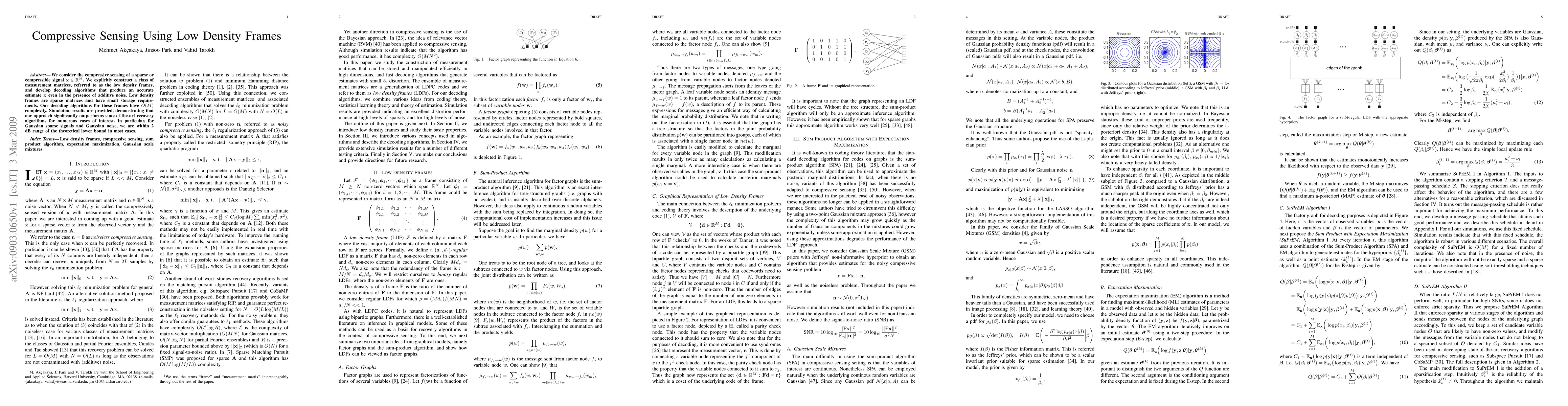 The research constructs a class of measurement matrices called Low Density Frames (LDFs) and develops decoding algorithms with O(M) complexity for sparse or compressible signals, demonstrating their performance through simulations.