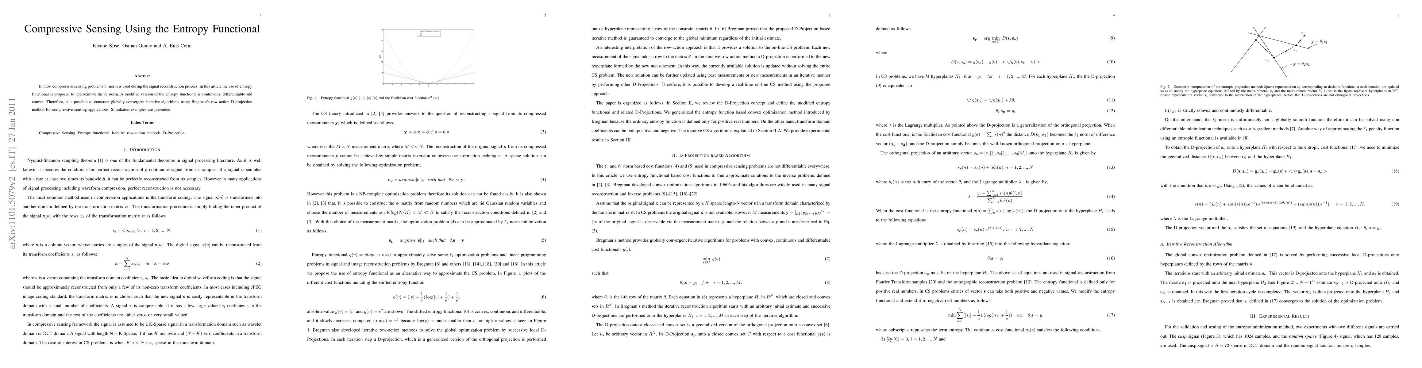 The paper introduces a continuous and differentiable entropy functional for compressive sensing, along with an iterative reconstruction algorithm based on Bregman's row action D-projection method.