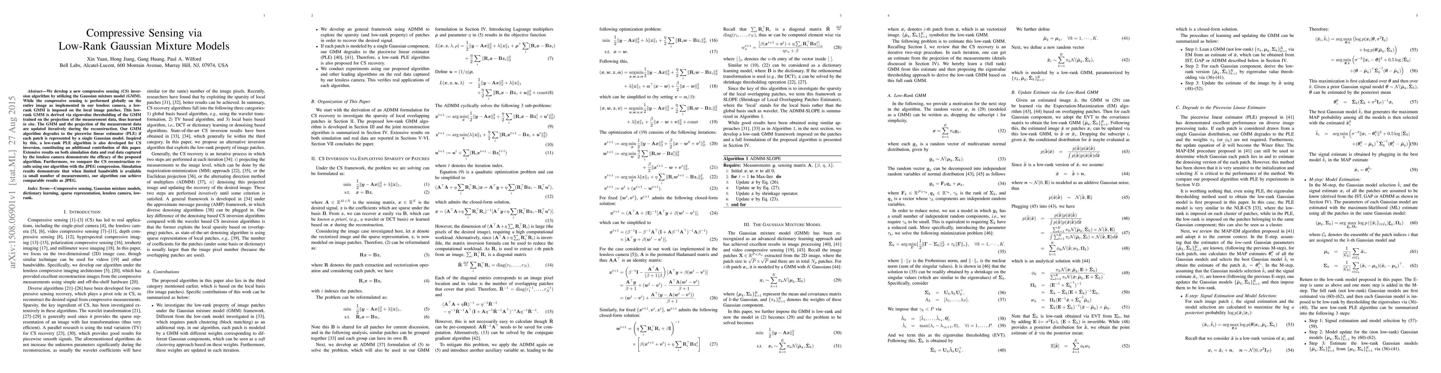 This paper proposes a new compressive sensing inversion algorithm using a low-rank Gaussian mixture model (GMM) for image reconstruction. The algorithm iteratively updates a GMM and its projection, achieving results comparable to JPEG compression under limited bandwidth.