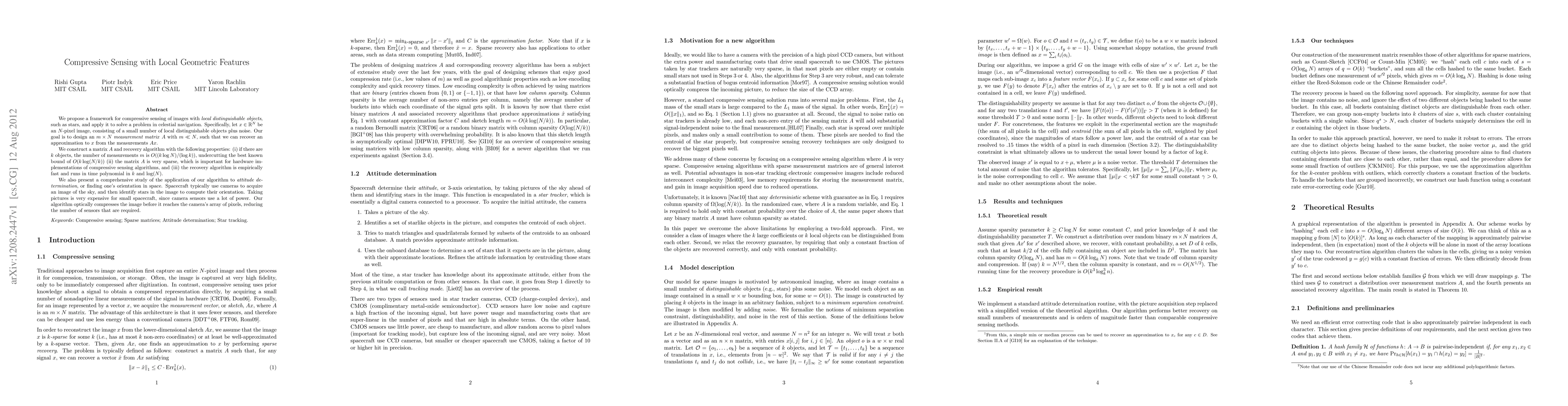 We propose a framework for compressive sensing of images with local distinguishable objects, such as stars, and apply it to solve a problem in celestial navigation. Specifically, let x be an N-pixel real-valued image, consisting of a small number of local distinguishable objects plus noise. Our goal is to design an m-by-N measurement matrix A with m << N, such that we can recover an approximation to x from the measurements Ax. We construct a matrix A and recovery algorithm with the following properties: (i) if there are k objects, the number of measurements m is O((k log N)/(log k)), undercutting the best known bound of O(k log(N/k)) (ii) the matrix A is very sparse, which is important for hardware implementations of compressive sensing algorithms, and (iii) the recovery algorithm is empirically fast and runs in time polynomial in k and log(N). We also present a comprehensive study of the application of our algorithm to attitude determination, or finding one's orientation in space. Spacecraft typically use cameras to acquire an image of the sky, and then identify stars in the image to compute their orientation. Taking pictures is very expensive for small spacecraft, since camera sensors use a lot of power. Our algorithm optically compresses the image before it reaches the camera's array of pixels, reducing the number of sensors that are required.