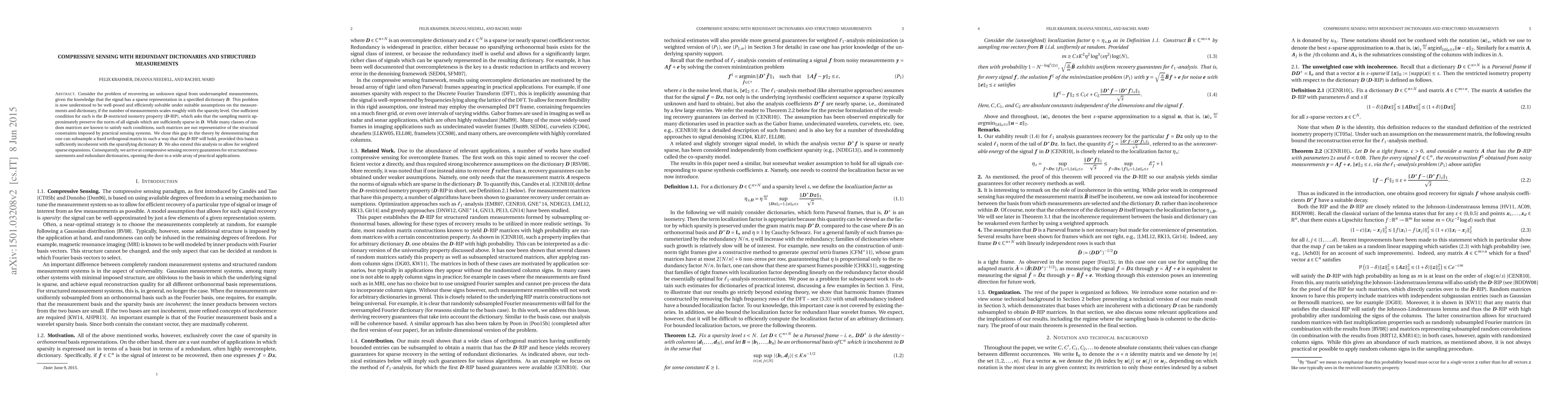 This paper addresses the problem of recovering sparse signals from undersampled measurements using structured matrices, demonstrating that subsampling a fixed orthogonal matrix can satisfy the $D$-RIP condition if the matrix is incoherent with the dictionary. It extends the analysis to weighted sparse expansions, providing recovery guarantees for practical applications.