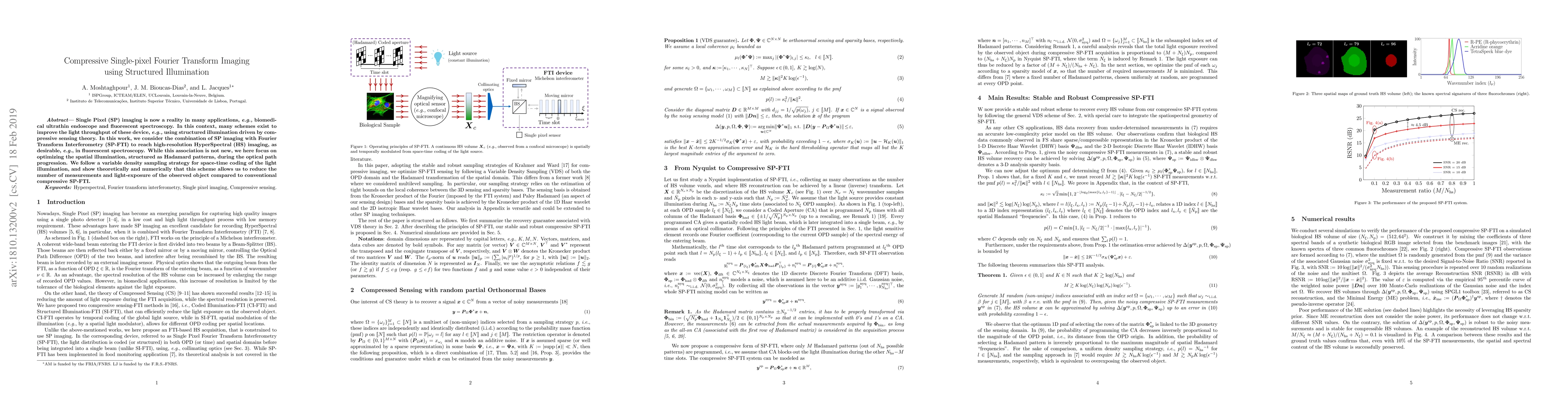 This paper proposes a compressive single-pixel Fourier Transform Imaging method using structured illumination, specifically Hadamard patterns, to optimize spatial illumination. It employs a variable density sampling strategy for space-time coding, demonstrating reduced measurement and light exposure requirements compared to conventional methods.