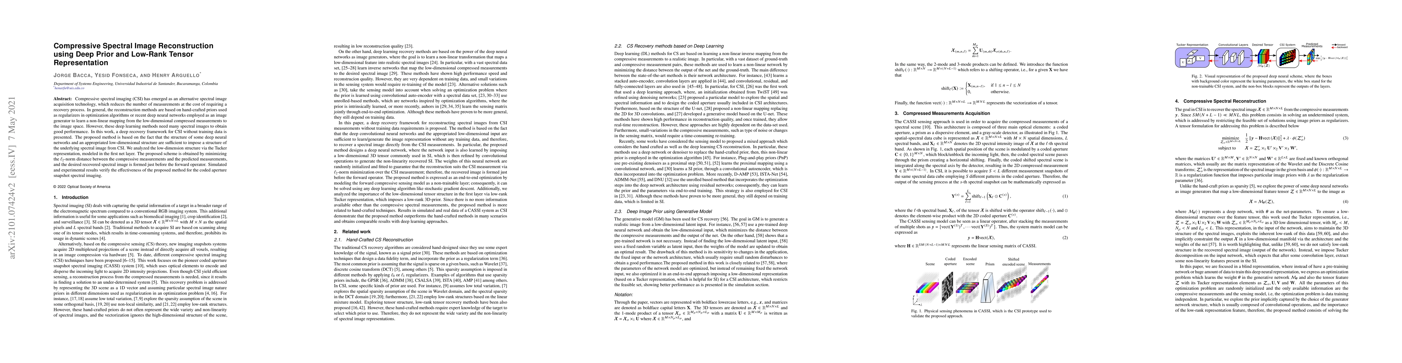 This paper proposes a deep recovery framework for compressive spectral imaging (CSI) that leverages a deep prior and low-rank tensor representation without requiring training data. The method uses a low-dimensional Tucker representation to model the underlying spectral image structure, achieving effective reconstruction by minimizing the $\ell_2$-norm distance between compressive measurements and predicted measurements.