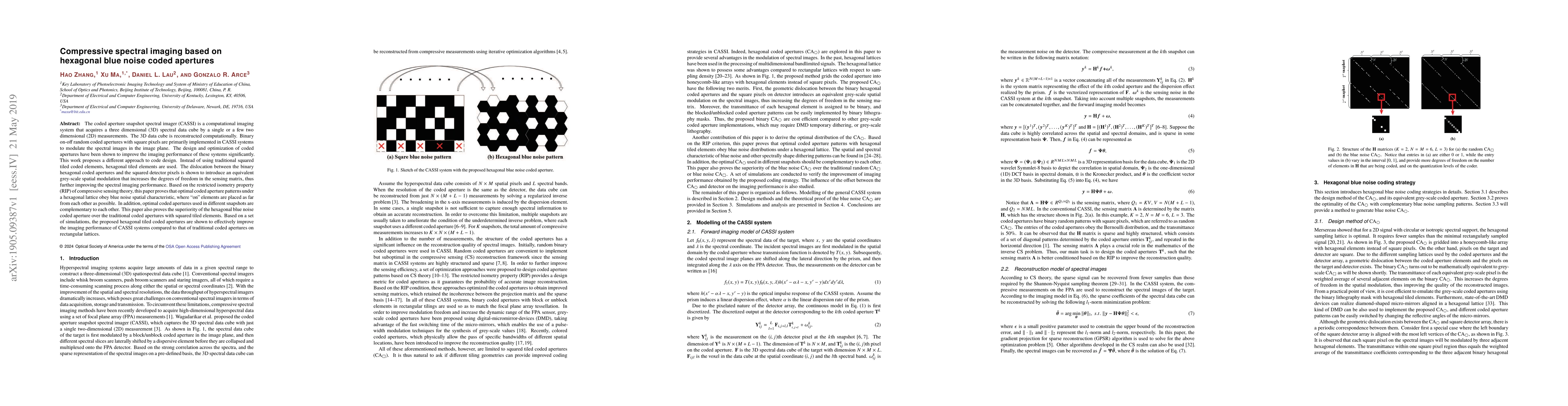 This paper proposes a novel hexagonal blue noise coded aperture design for compressive spectral imaging in CASSI systems, which enhances spectral imaging performance by introducing equivalent grey-scale spatial modulation through dislocation between hexagonal and square pixels. The study proves the superiority of hexagonal blue noise coded apertures over traditional square lattice designs based on the restricted isometry property criterion.