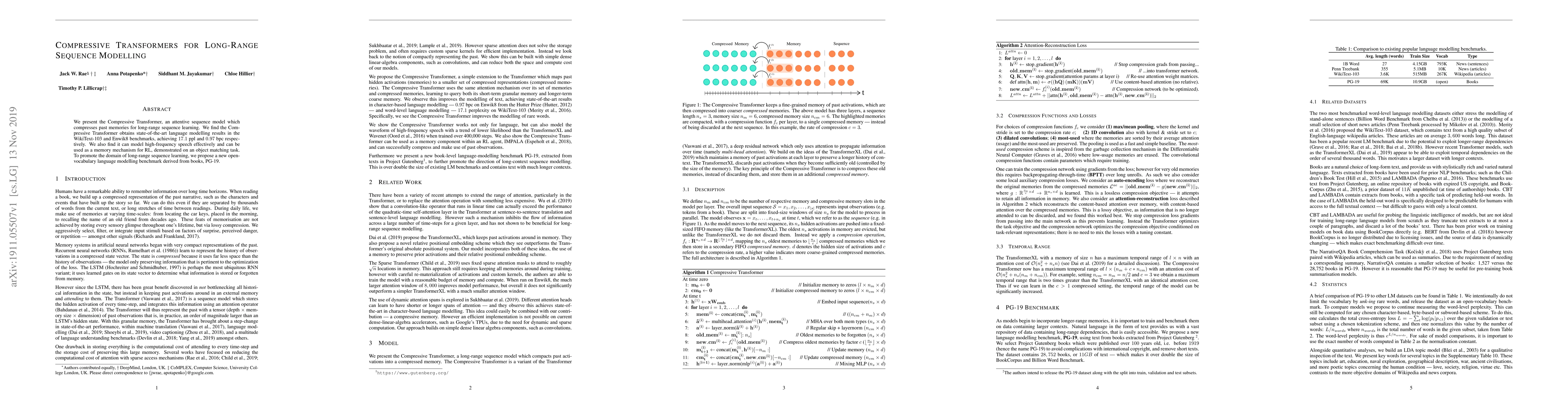 The Compressive Transformer is an efficient attentive sequence model that compresses past memories for superior long-range sequence learning, achieving state-of-the-art results in language modelling and high-frequency speech modelling, and introducing a new open-vocabulary language modelling benchmark, PG-19.