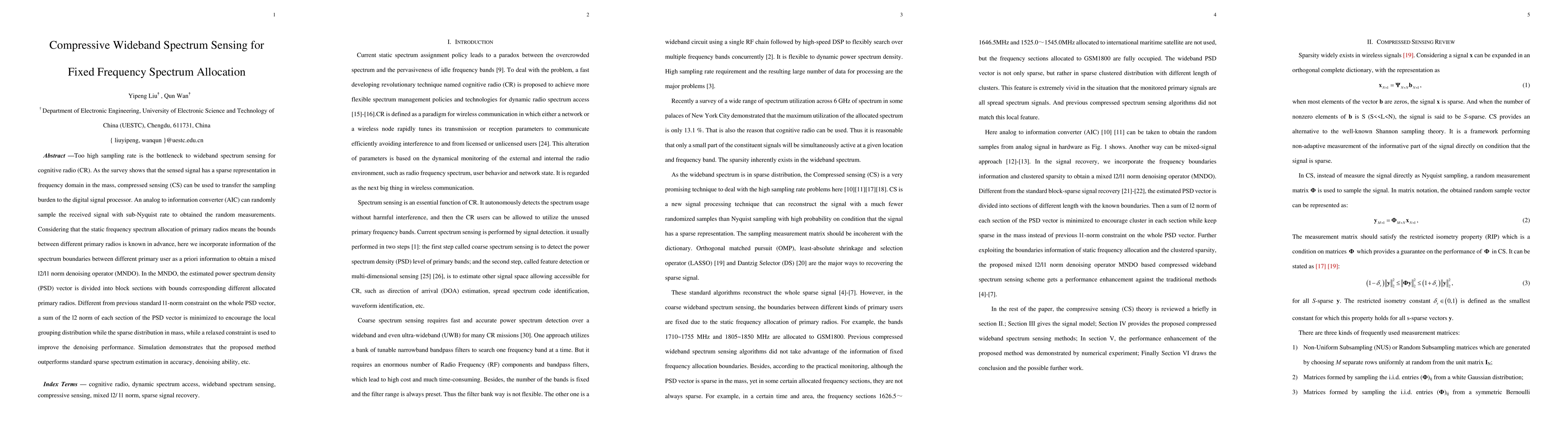 This paper proposes a compressive wideband spectrum sensing method for cognitive radio using compressed sensing to reduce sampling rates. It introduces a mixed l2/l1 norm denoising operator that leverages known spectrum boundaries to enhance accuracy and denoising performance, outperforming standard sparse spectrum estimation methods.