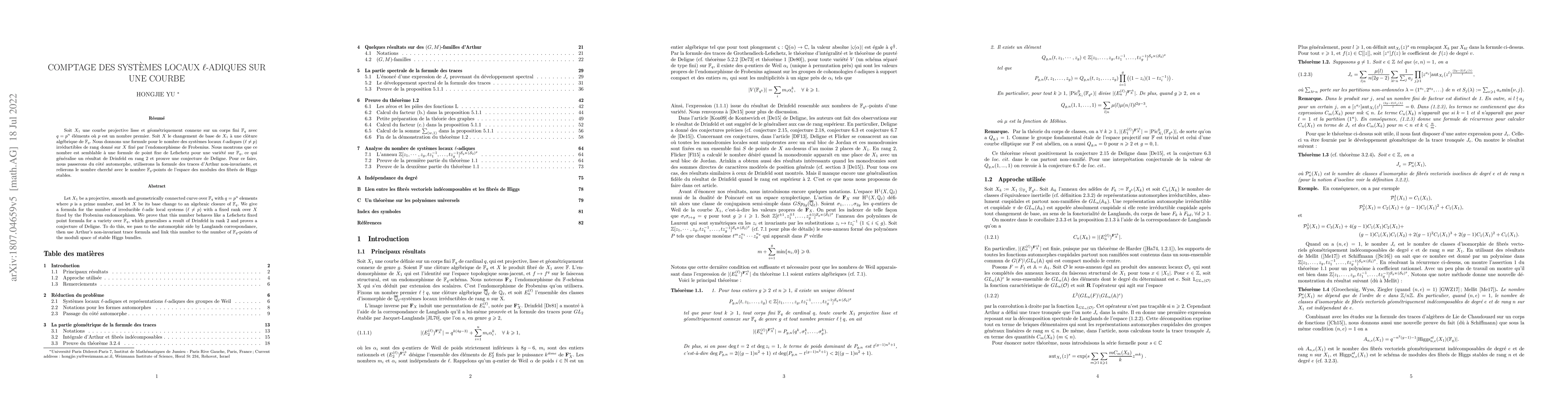 Let $X_{1}$ be a projective, smooth and geometrically connected curve over $\mathbb{F}_{q}$ with $q=p^{n}$ elements where $p$ is a prime number, and let $X$ be its base change to an algebraic closure of $\mathbb{F}_{q}$. We give a formula for the number of irreducible $\ell$-adic local systems ($\ell\neq p$) with a fixed rank over $X$ fixed by the Frobenius endomorphism. We prove that this number behaves like a Lefschetz fixed point formula for a variety over $\mathbb{F}_q$, which generalises a result of Drinfeld in rank $2$ and proves a conjecture of Deligne. To do this, we pass to the automorphic side by Langlands correspondence, then use Arthur's non-invariant trace formula and link this number to the number of $\mathbb{F}_q$-points of the moduli space of stable Higgs bundles.