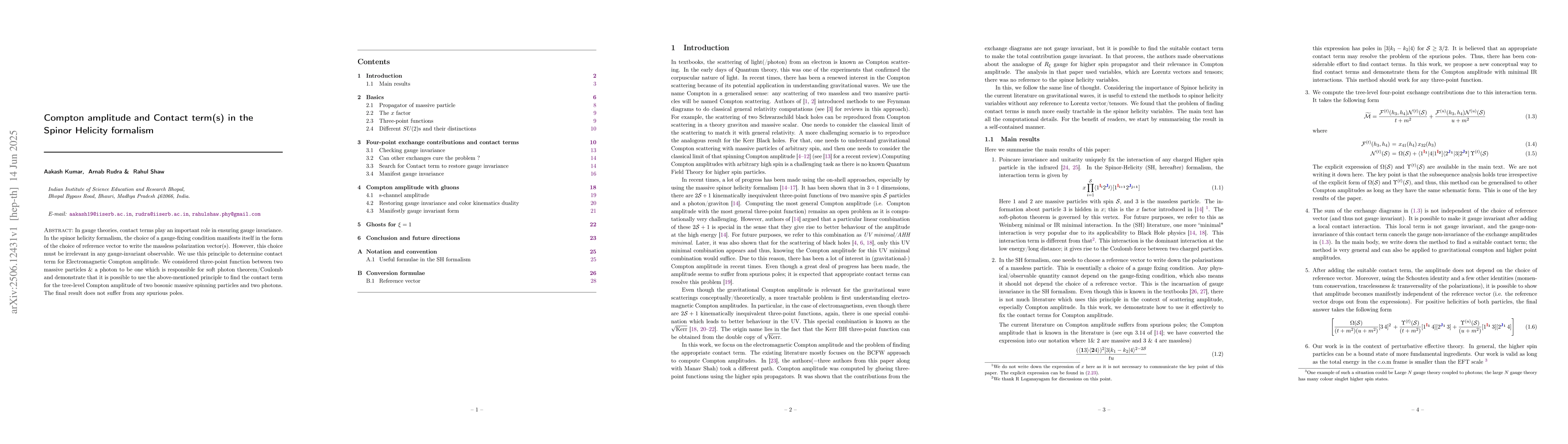 In gauge theories, contact terms play an important role in ensuring gauge invariance. In the spinor helicity formalism, the choice of a gauge-fixing condition manifests itself in the form of the choice of reference vector to write the massless polarization vector(s). However, this choice must be irrelevant in any gauge-invariant observable. We use this principle to determine contact term for Electromagnetic Compton amplitude. We considered three-point function between two massive particles \& a photon to be one which is responsible for soft photon theorem/Coulomb and demonstrate that it is possible to use the above-mentioned principle to find the contact term for the tree-level Compton amplitude of two bosonic massive spinning particles and two photons. The final result does not suffer from any spurious poles.