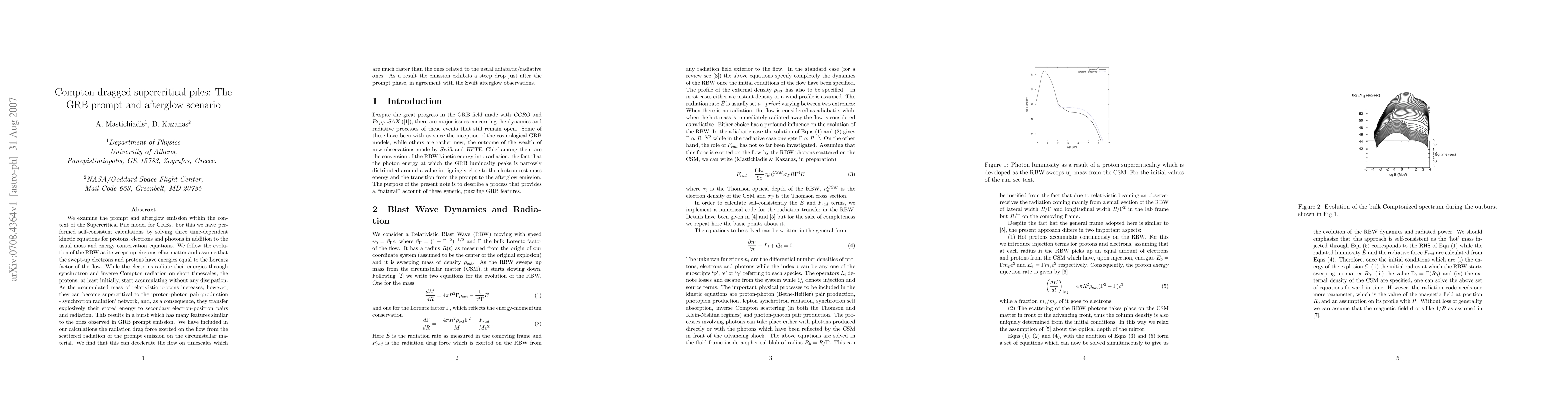 The paper presents a model for Gamma-Ray Bursts (GRBs) using the Supercritical Pile scenario. It solves kinetic equations for protons, electrons, and photons, showing that proton accumulation and subsequent explosive energy transfer to secondary pairs and radiation can mimic GRB prompt emission features. The model also incorporates radiation drag force from scattered prompt emission, causing rapid flow deceleration and a steep drop in emission post-prompt, aligning with Swift afterglow observations.