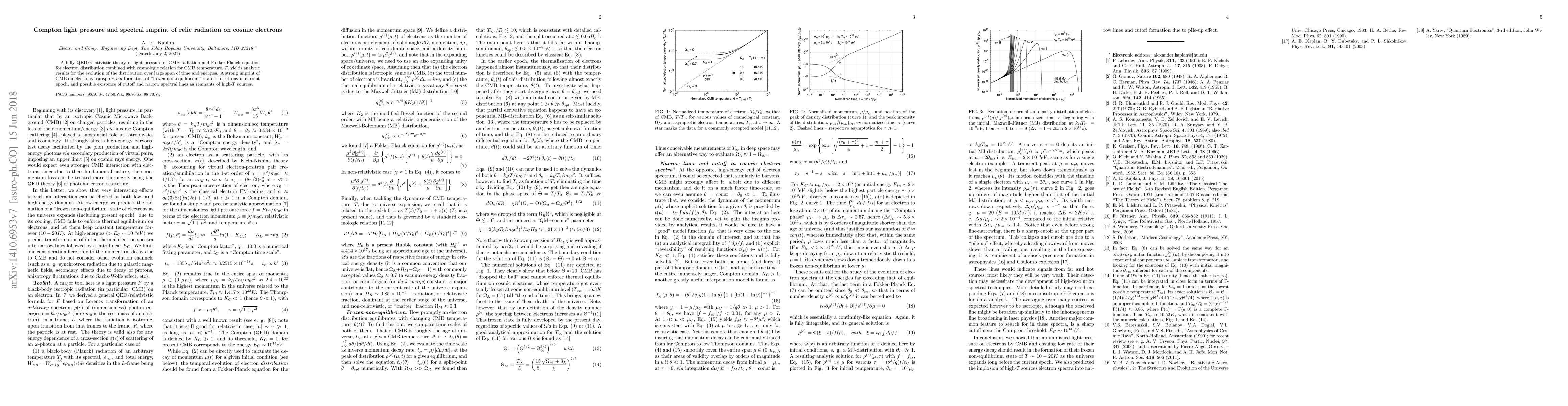A fully QED/relativistic theory of light pressure of CMB radiation and Fokker-Planck equation for electron distribution combined with cosmologic relation for CMB temperature, T, yields analytic results for the evolution of the distribution over large span of time and energies. A strong imprint of CMB on electrons transpires via formation of "frozen non-equilibrium" state of electrons in current epoch, and possible existence of cutoff and narrow spectral lines as remnants of high-T sources.
