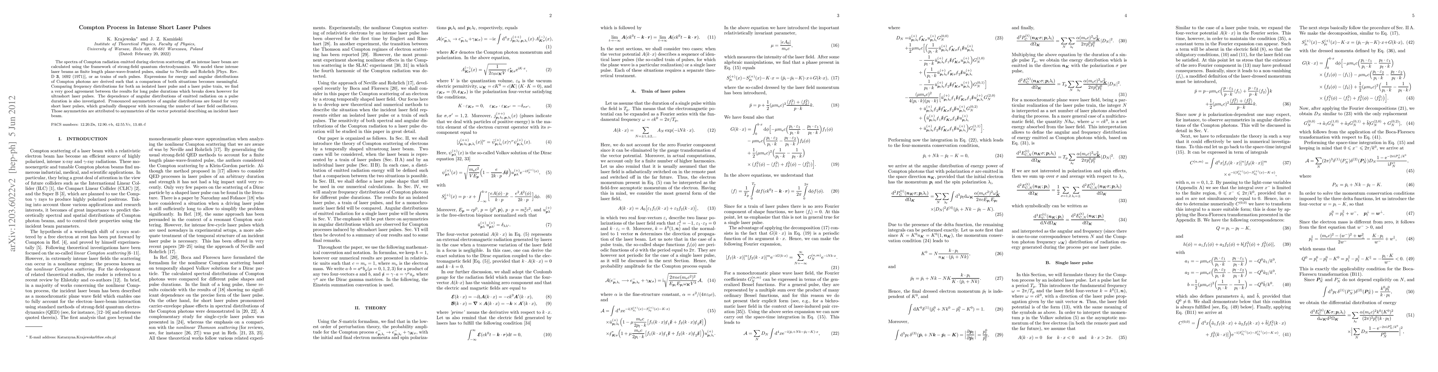 This paper calculates the spectra of Compton radiation from electron scattering in intense short laser pulses using strong-field quantum electrodynamics. It finds good agreement between isolated pulse and pulse train models for long pulses, but pronounced asymmetries in angular distributions for ultrashort pulses, which diminish with more oscillations.