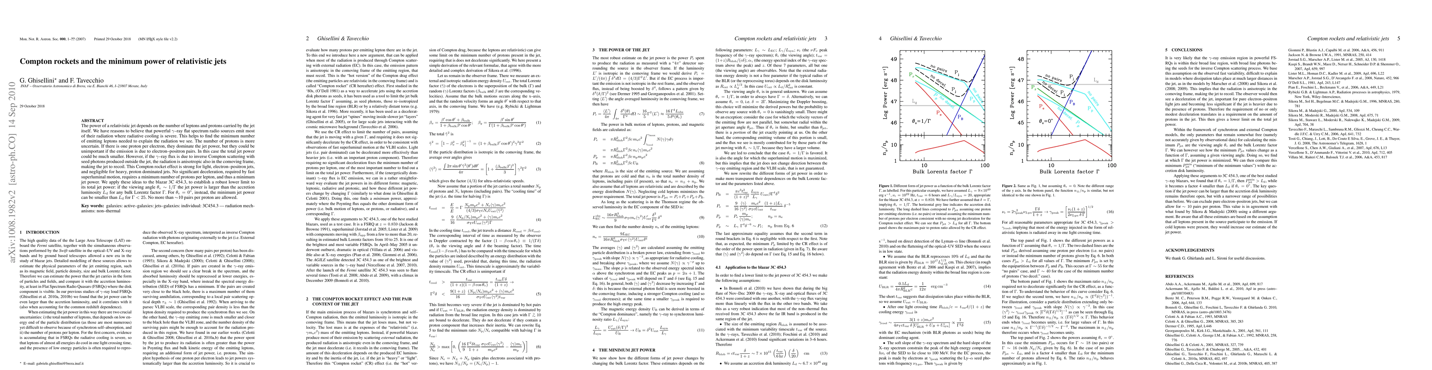 The power of a relativistic jet depends on the number of leptons and protons carried by the jet itself. We have reasons to believe that powerful gamma-ray flat spectrum radio sources emit most of their radiation where radiative cooling is severe. This helps to find the minimum number of emitting leptons needed to explain the radiation we see. The number of protons is more uncertain. If there is one proton per electron, they dominate the jet power, but they could be unimportant if the emission is due to electron-positron pairs. In this case the total jet power could be much smaller. However, if the gamma-ray flux is due to inverse Compton scattering with seed photons produced outside the jet, the radiation is anisotropic also in the comoving frame, making the jet to recoil. This Compton rocket effect is strong for light, electron-positron jets, and negligible for heavy, proton dominated jets. No significant deceleration, required by fast superluminal motion, requires a minimum number of protons per lepton, and thus a minimum jet power. We apply these ideas to the blazar 3C 454.3, to find a robust lower limit to its total jet power: if the viewing angle theta_v ~ 1/Gamma the jet power is larger than the accretion luminosity L_d for any bulk Lorentz factor Gamma. For theta_v =0, instead, the minimum jet power can be smaller than L_d for Gamma<25. No more than ~10 pairs per proton are allowed.