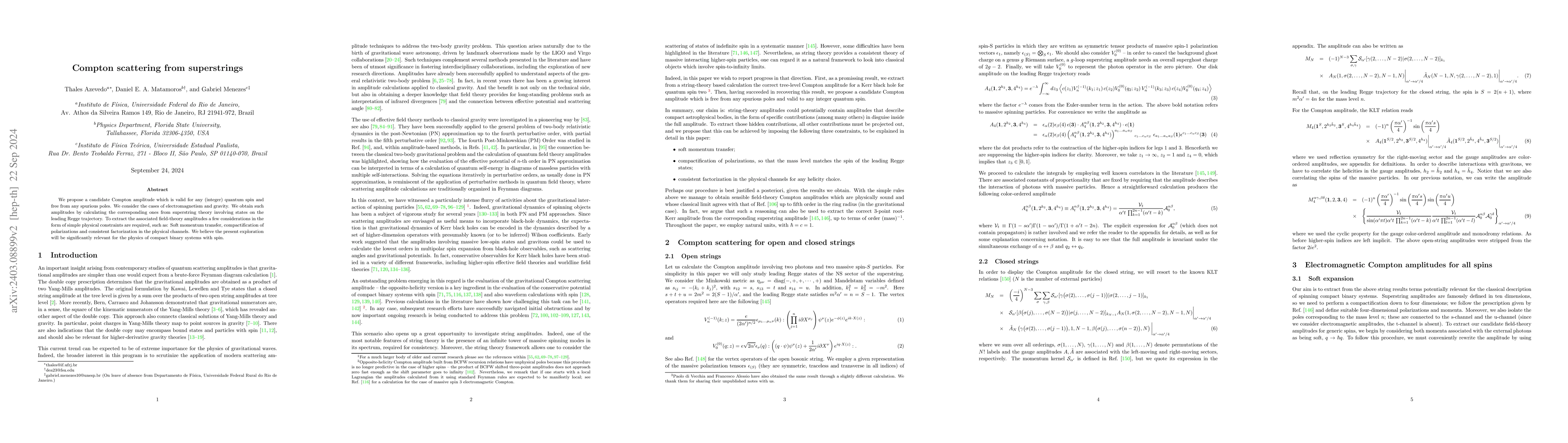 This paper proposes a Compton scattering amplitude for any integer quantum spin derived from superstring theory, free of spurious poles, applicable to electromagnetism and gravity. The approach involves extracting field-theory amplitudes through physical constraints, potentially relevant for understanding compact binary systems with spin.