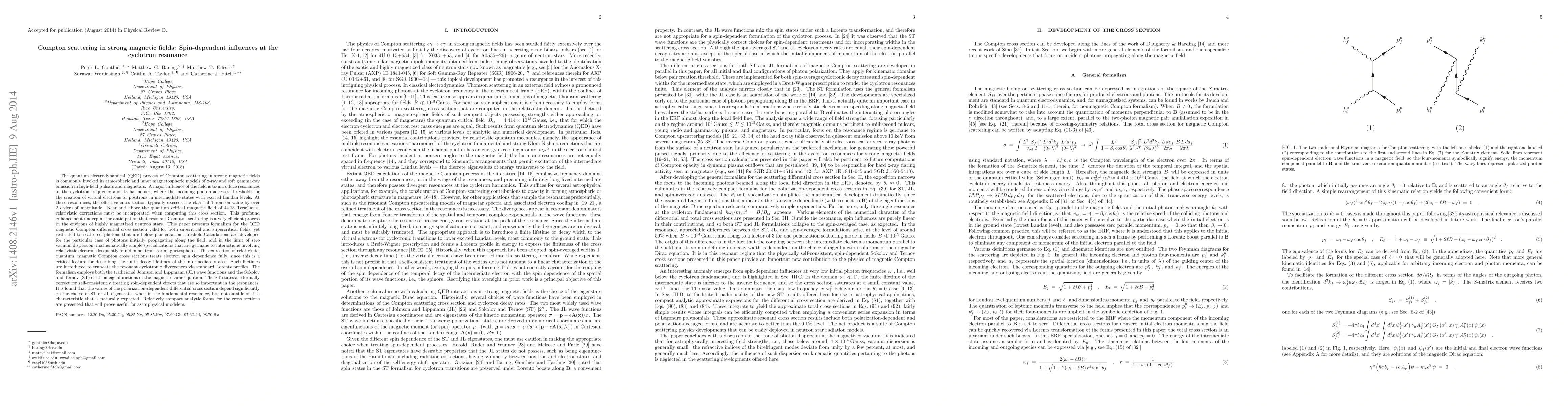 This paper develops a formalism for the quantum electrodynamical process of Compton scattering in strong magnetic fields, focusing on spin-dependent influences at cyclotron resonance. It provides analytic expressions for the magnetic Compton differential cross section, incorporating relativistic corrections and treating electron spin dependence fully, which is crucial for describing intermediate state decay lifetimes in astrophysical models.