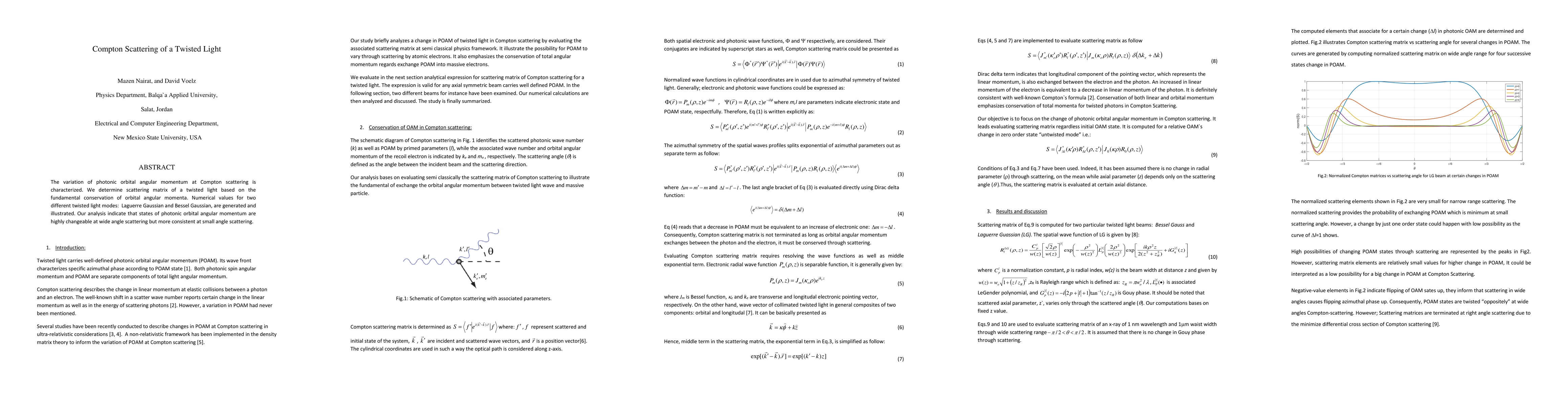 This paper characterizes the variation of photonic orbital angular momentum during Compton scattering, determining the scattering matrix for twisted light modes like Laguerre Gaussian and Bessel Gaussian. It finds that while orbital angular momentum states change significantly at wide-angle scattering, they remain more consistent at small-angle scattering.