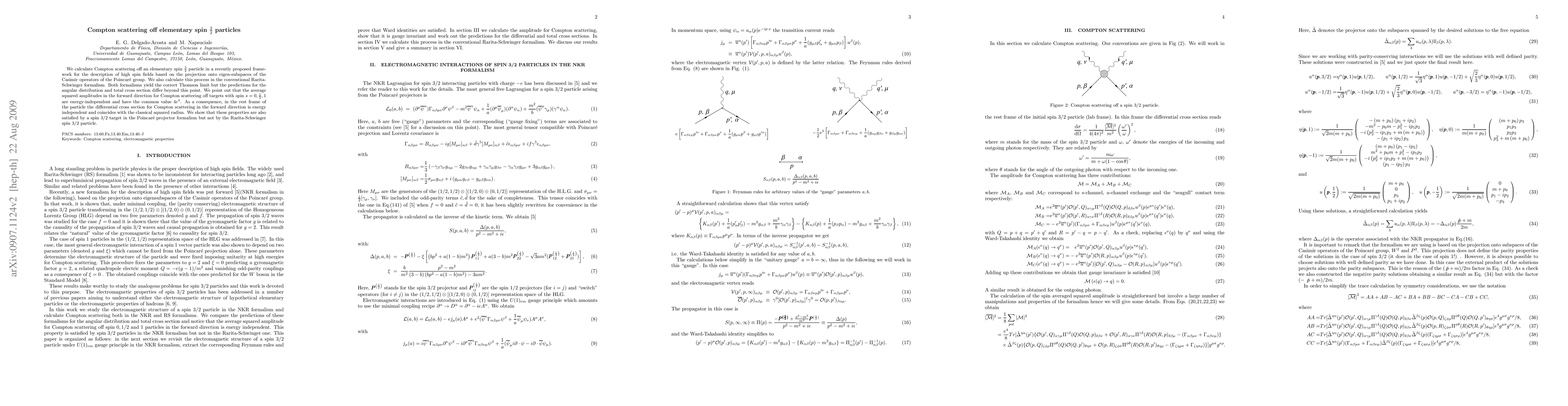 This paper investigates Compton scattering off spin 3/2 particles using two different theoretical frameworks: the Poincare projector formalism and the Rarita-Schwinger formalism. Both yield the correct Thomson limit but differ in predictions for angular distribution and total cross section.