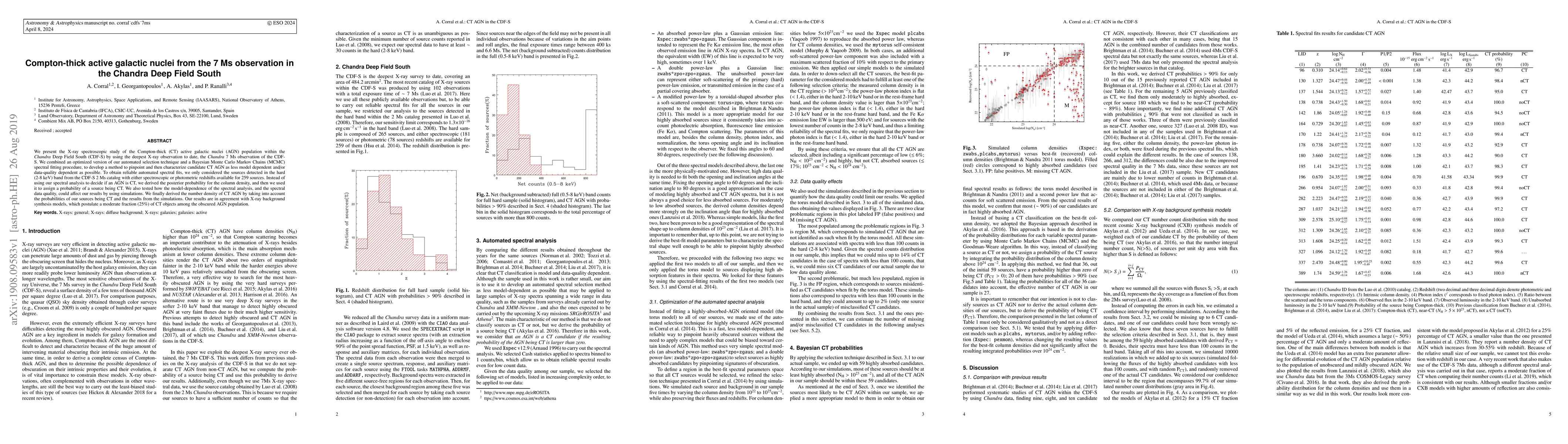 This study uses the Chandra Deep Field South 7 Ms observation to identify and characterize Compton-thick active galactic nuclei (AGN) through an optimized selection technique and Bayesian spectral analysis. The research finds a moderate fraction (25%) of CT AGN among obscured AGN, consistent with X-ray background synthesis models.
