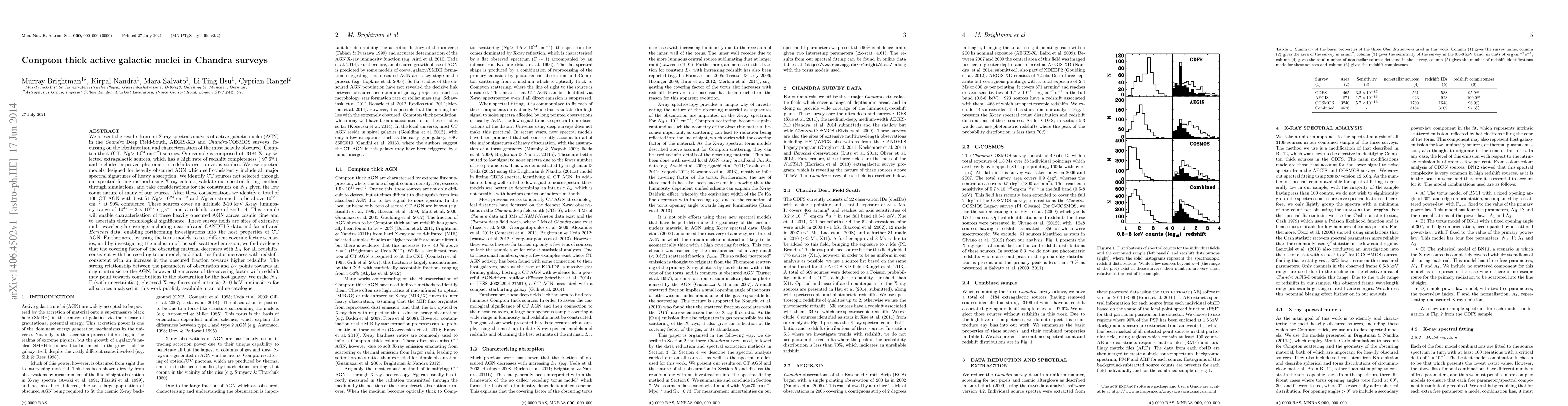 We present the results from an X-ray spectral analysis of active galactic nuclei (AGN) in the Chandra Deep Field-South, AEGIS-XD and Chandra-COSMOS surveys, focussing on the identification and characterisation of the most heavily obscured, Compton thick (CT, $N_{H}>10^{24} cm^{-2}$) sources. Our sample is comprised of 3184 X-ray selected extragalactic sources, which has a high rate of redshift completeness (97.6 %), and includes improved photometric redshifts over previous studies. We use spectral models designed for heavily obscured AGN which self consistently include all major spectral signatures of heavy absorption. We identify CT sources not selected through our spectral fitting method using X-ray colours, validate our spectral fitting method through simulations, and take considerations for the constraints on $N_{H}$ given the low count nature of many of our sources. After these considerations we identify a total of 100 CT AGN with best-fit $N_{H}>10^{24} cm^{-2}$ and $N_{H}$ constrained to be above $10^{23.5} cm^{-2}$ at 90% confidence. These sources cover an intrinsic $L_{X}$ range of $10^{42}-3x10^{45}$ ergs s$^{-1}$ and a redshift range of z=0.1-4. This sample will enable characterisation of these heavily obscured AGN across cosmic time and to ascertain their cosmological significance. Furthermore, by using the torus models to test different covering factor scenarios, and by investigating the inclusion of the soft scattered emission, we find evidence that the covering factor of the obscuring material decreases with $L_{X}$ for all redshifts, consistent with the receding torus model, and that this factor increases with redshift, consistent with an increase in the obscured fraction towards higher redshifts. We make $N_{H}$, $\Gamma$ (with uncertainties), observed X-ray fluxes and intrinsic $L_{X}$ for all sources analysed in this work publicly available in an online catalogue.