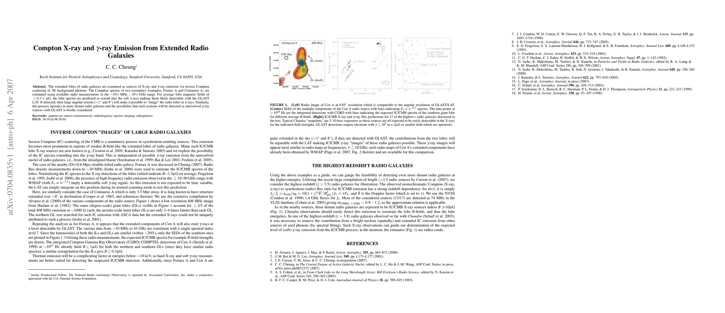 This study investigates X-ray and gamma-ray emissions from the extended lobes of radio galaxies through inverse Compton scattering of cosmic microwave background photons. By analyzing Fornax A and Centaurus A, it predicts that their gamma-ray spectra could be detectable by GLAST, offering potential for gamma-ray imaging of large radio lobes.