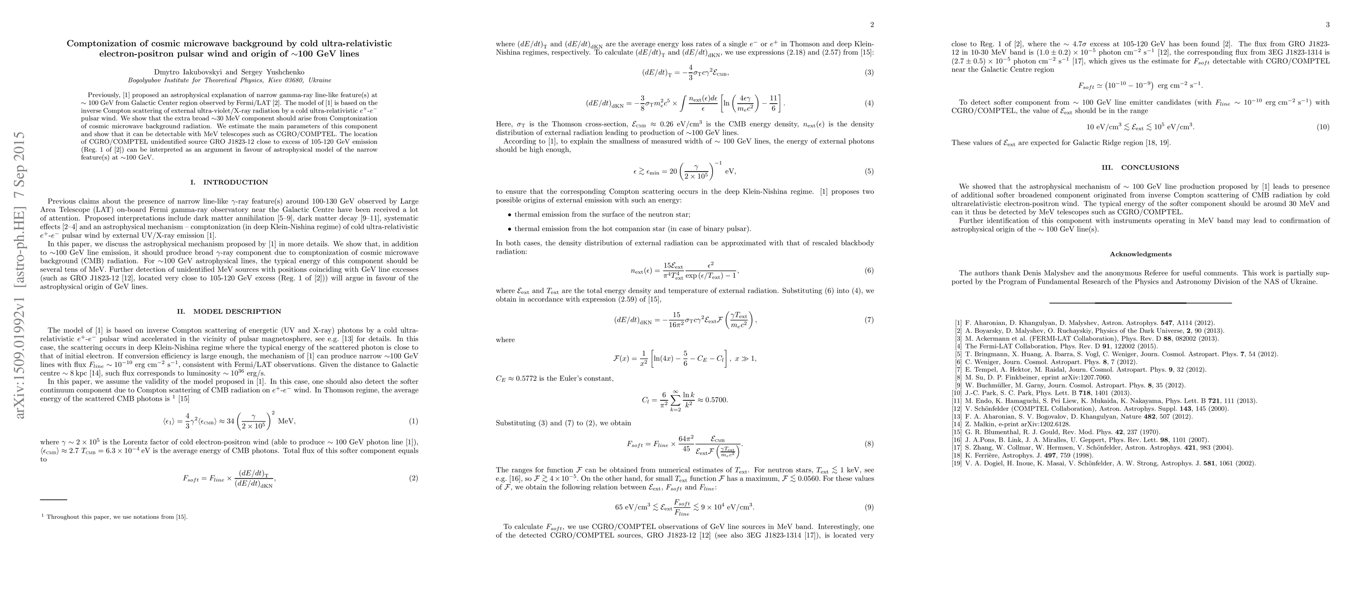 This paper explores the Comptonization of cosmic microwave background radiation by a cold ultra-relativistic electron-positron pulsar wind, proposing it as an origin for the ~100 GeV gamma-ray lines observed in the Galactic Center. It suggests that this process could produce a detectable broad ~30 MeV component, supporting the astrophysical model for the observed gamma-ray features.