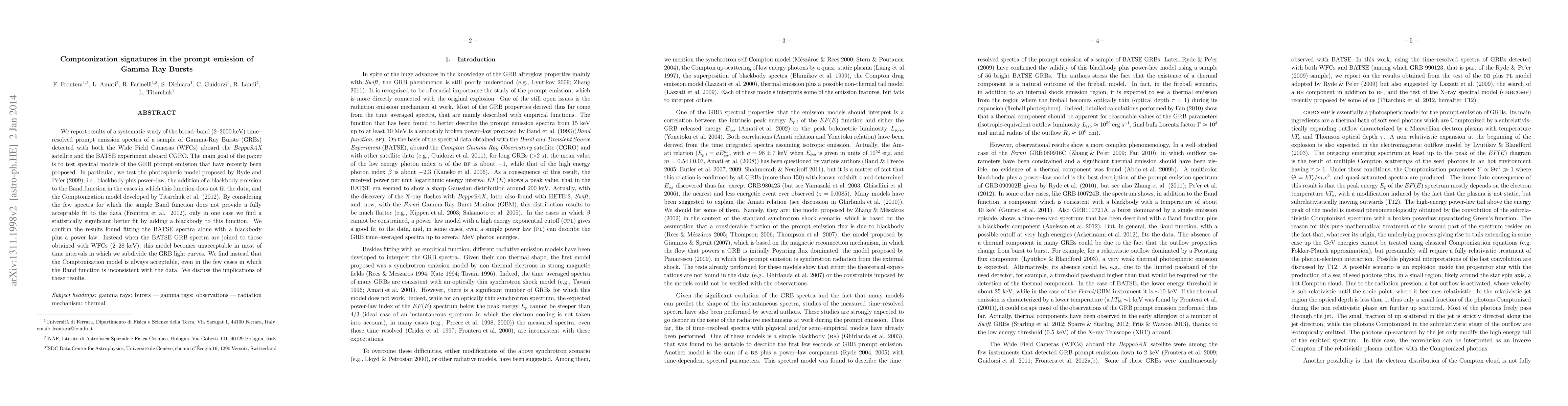 We report results of a systematic study of the broad--band (2--2000 keV) time--resolved prompt emission spectra of a sample of Gamma-Ray Bursts (GRBs) detected with both the Wide Field Cameras (WFCs) aboard the BeppoSAX satellite and the BATSE experiment aboard CGRO. The main goal of the paper is to test spectral models of the GRB prompt emission that have recently been proposed. In particular, we test the photospheric model proposed by Ryde and Pe'er (2009), i.e., blackbody plus power--law, the addition of a blackbody emission to the Band function in the cases in which this function does not fit the data, and the Comptonization model developed by Titarchuk et al. (2012). By considering the few spectra for which the simple Band function does not provide a fully acceptable fit to the data (Frontera et al. 2012), only in one case we find a statistically significant better fit by adding a blackbody to this function. We confirm the results found fitting the BATSE spectra alone with a blackbody plus a power law. Instead when the BATSE GRB spectra are joined to those obtained with WFCs (2--28 keV), this model becomes unacceptable in most of time intervals in which we subdivide the GRB light curves. We find instead that the Comptonization model is always acceptable, even in the few cases in which the Band function is inconsistent with the data. We discuss the implications of these results.
