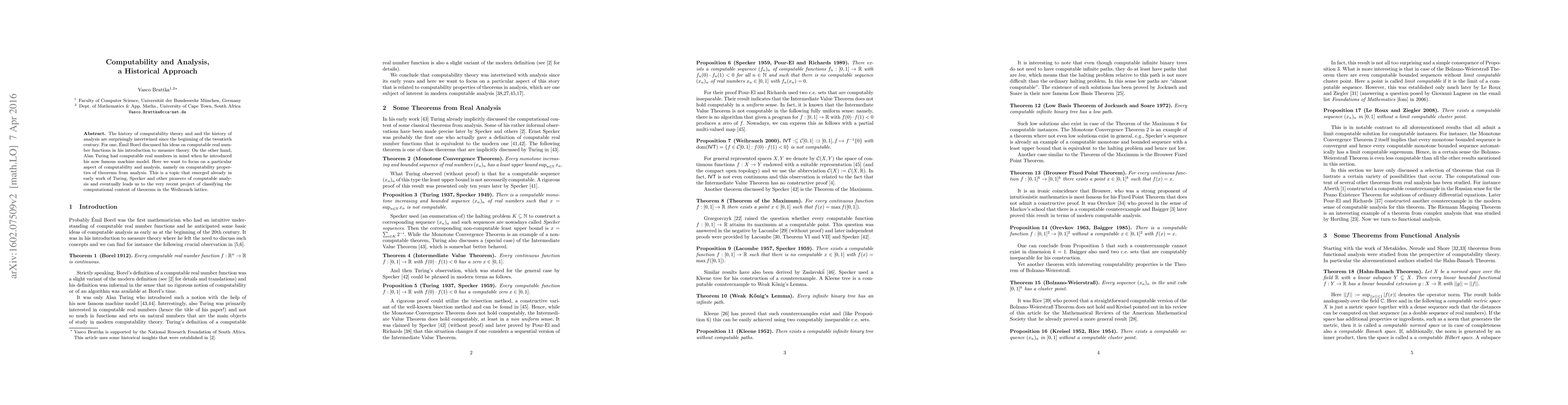 This paper explores the historical connections between computability theory and analysis, highlighting early discussions by Borel and Turing, and focuses on computability properties of theorems in analysis, culminating in the modern Weihrauch lattice classification project.