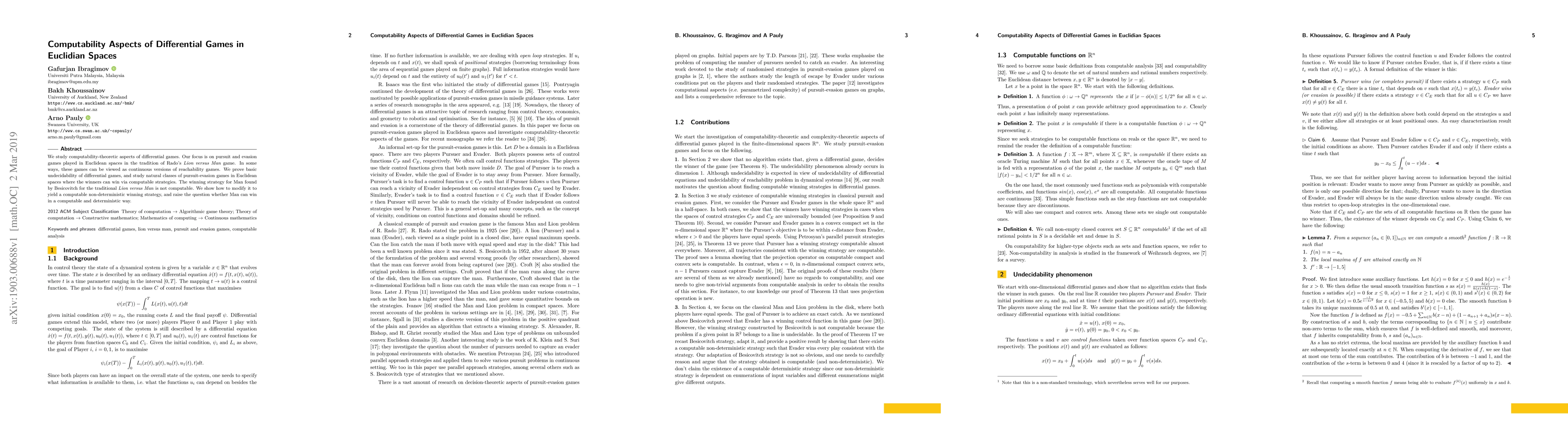 We study computability-theoretic aspects of differential games. Our focus is on pursuit and evasion games played in Euclidean spaces in the tradition of Rado's "Lion versus Man" game. In some ways, these games can be viewed as continuous versions of reachability games. We prove basic undecidability of differential games, and study natural classes of pursuit-evasion games in Euclidean spaces where the winners can win via computable strategies. The winning strategy for Man found by Besicovitch for the traditional "Lion versus Man" is not computable. We show how to modify it to yield a computable non-deterministic winning strategy, and raise the question whether Man can win in a computable and deterministic way.