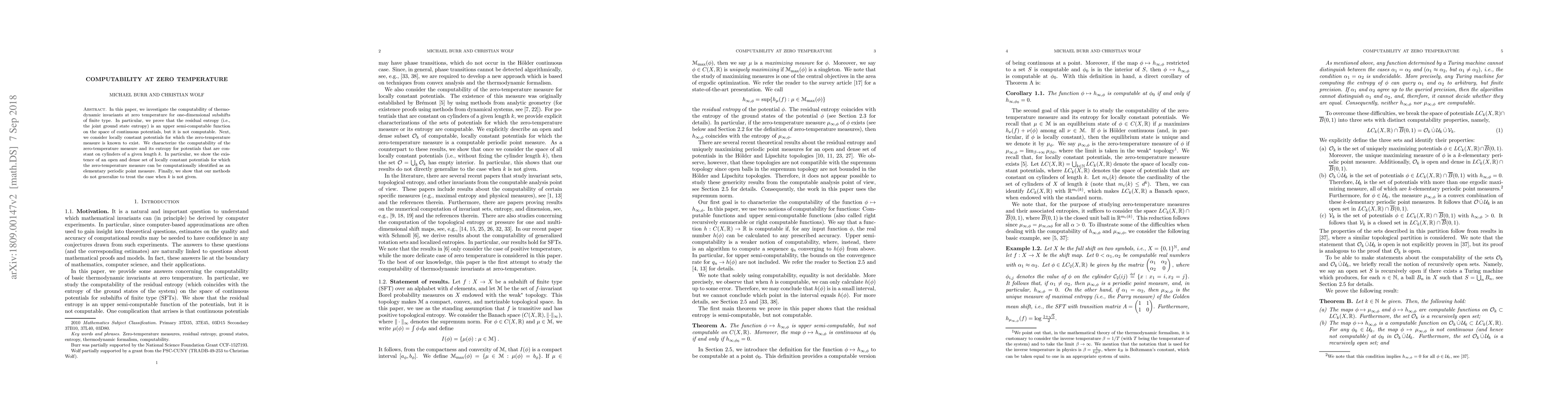 In this paper, we investigate the computability of thermodynamic invariants at zero temperature for one-dimensional subshifts of finite type. In particular, we prove that the residual entropy (i.e., the joint ground state entropy) is an upper semi-computable function on the space of continuous potentials, but it is not computable. Next, we consider locally constant potentials for which the zero-temperature measure is known to exist. We characterize the computability of the zero-temperature measure and its entropy for potentials that are constant on cylinders of a given length k. In particular, we show the existence of an open and dense set of locally constant potentials for which the zero-temperature measure can be computationally identified as an elementary periodic point measure. Finally, we show that our methods do not generalize to treat the case when k is not given