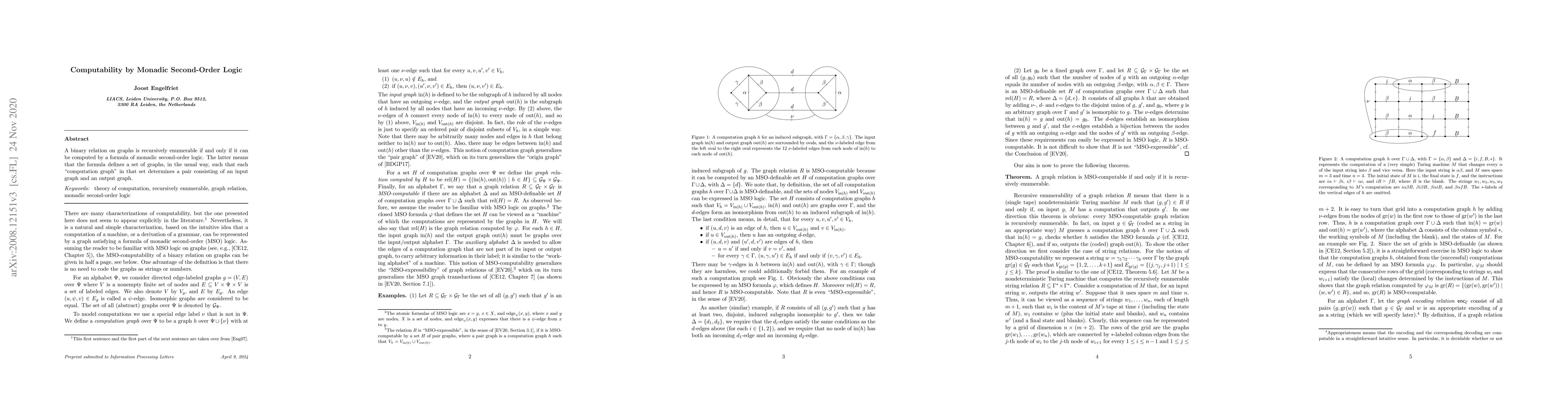 Summary: This paper establishes that a binary relation on graphs is recursively enumerable if and only if it can be computed using formulas in monadic second-order logic, thereby linking computability to the expressive power of this logic.