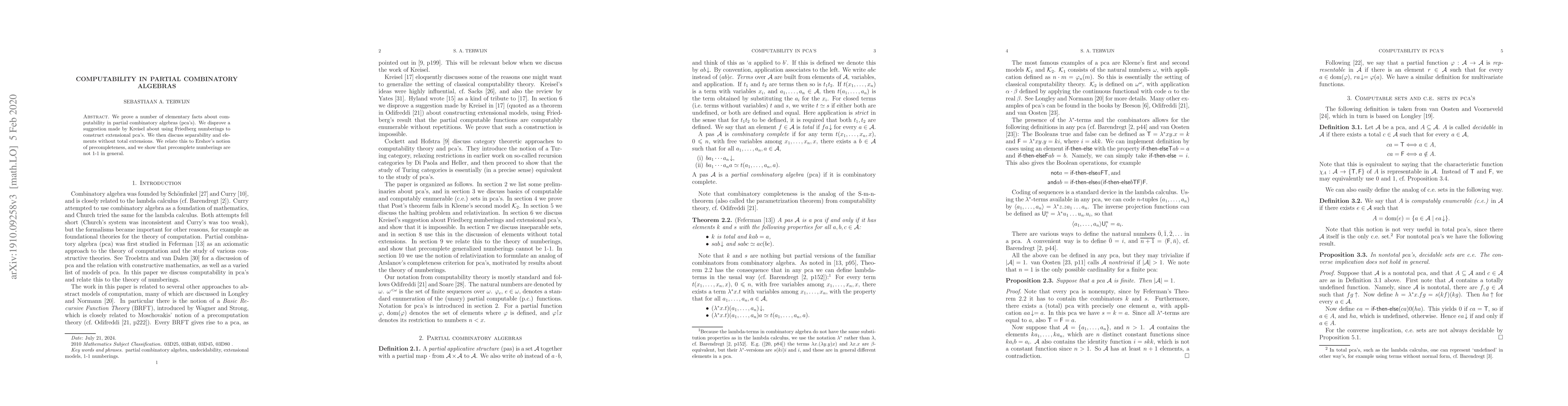 We prove a number of elementary facts about computability in partial combinatory algebras (pca's). We disprove a suggestion made by Kreisel about using Friedberg numberings to construct extensional pca's. We then discuss separability and elements without total extensions. We relate this to Ershov's notion of precompleteness, and we show that precomplete numberings are not 1-1 in general.