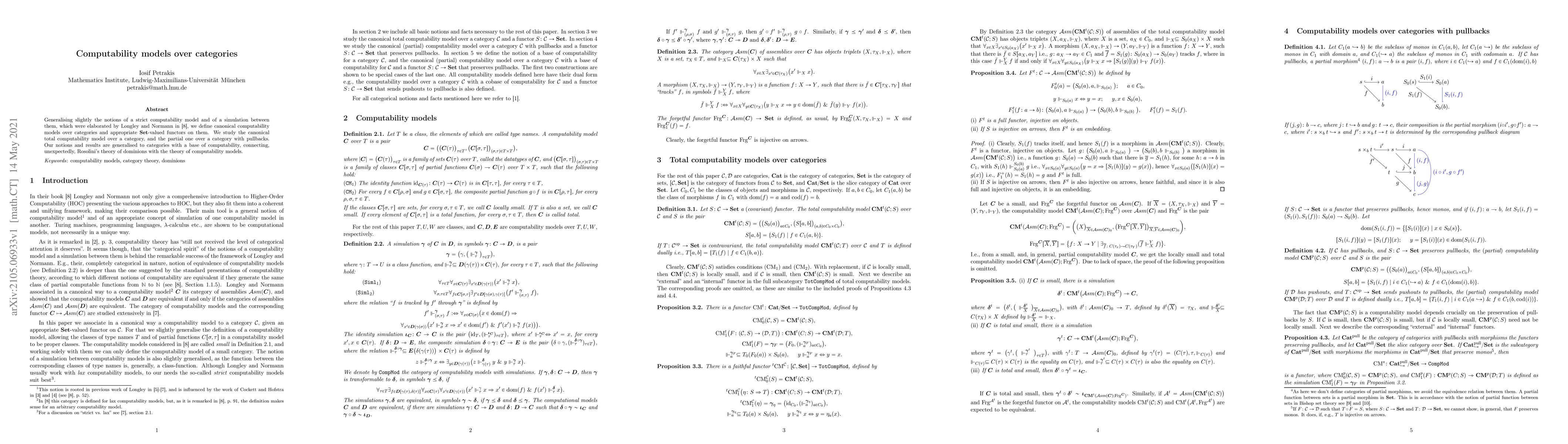 Generalising slightly the notions of a strict computability model and of a simulation between them, which were elaborated by Longley and Normann, we define canonical computability models over categories and appropriate Set-valued functors on them. We study the canonical total computability model over a category, and the partial one over a category with pullbacks. Our notions and results are generalised to categories with a base of computability, connecting Rosolini's theory of dominions with the theory of computability models.