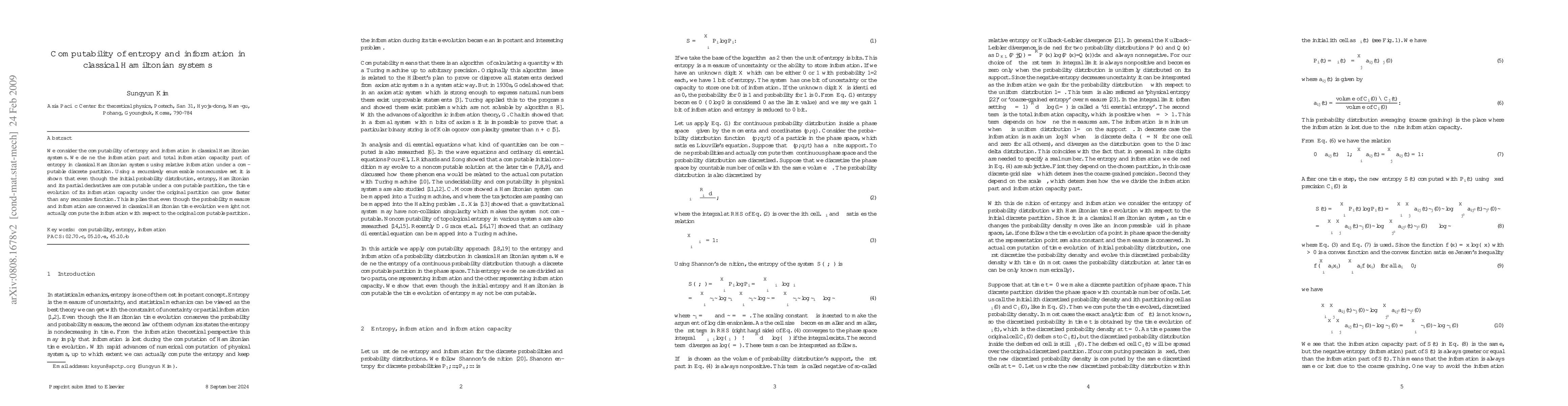 We consider the computability of entropy and information in classical Hamiltonian systems. We define the information part and total information capacity part of entropy in classical Hamiltonian systems using relative information under a computable discrete partition. Using a recursively enumerable nonrecursive set it is shown that even though the initial probability distribution, entropy, Hamiltonian and its partial derivatives are computable under a computable partition, the time evolution of its information capacity under the original partition can grow faster than any recursive function. This implies that even though the probability measure and information are conserved in classical Hamiltonian time evolution we might not actually compute the information with respect to the original computable partition.