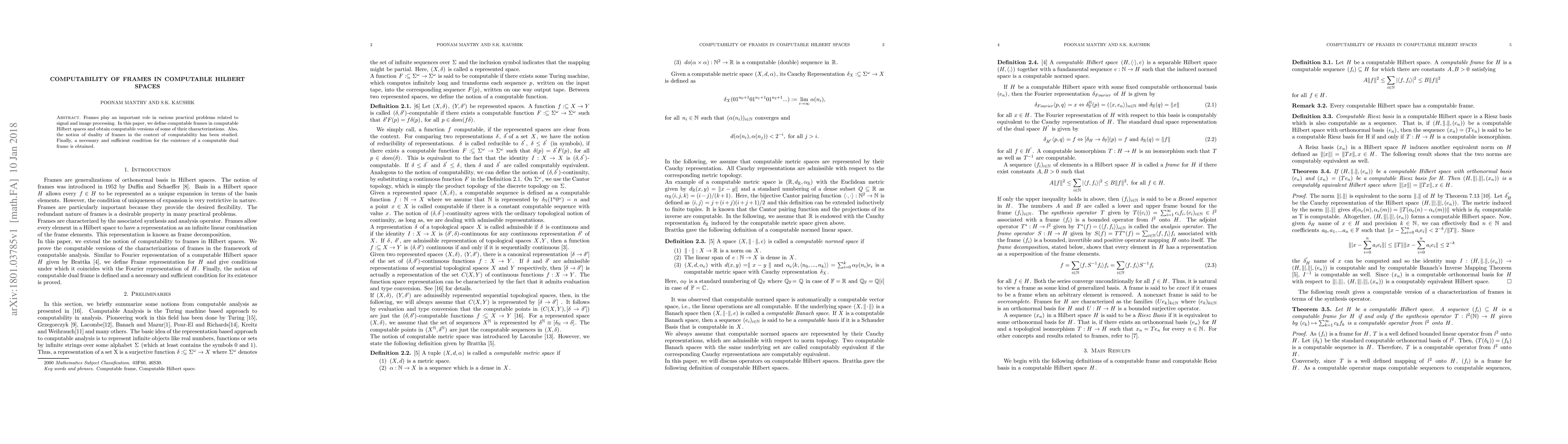This paper defines computable frames in computable Hilbert spaces and provides computable versions of their characterizations. It also explores the duality of frames within the computability framework and establishes a necessary and sufficient condition for the existence of a computable dual frame.
