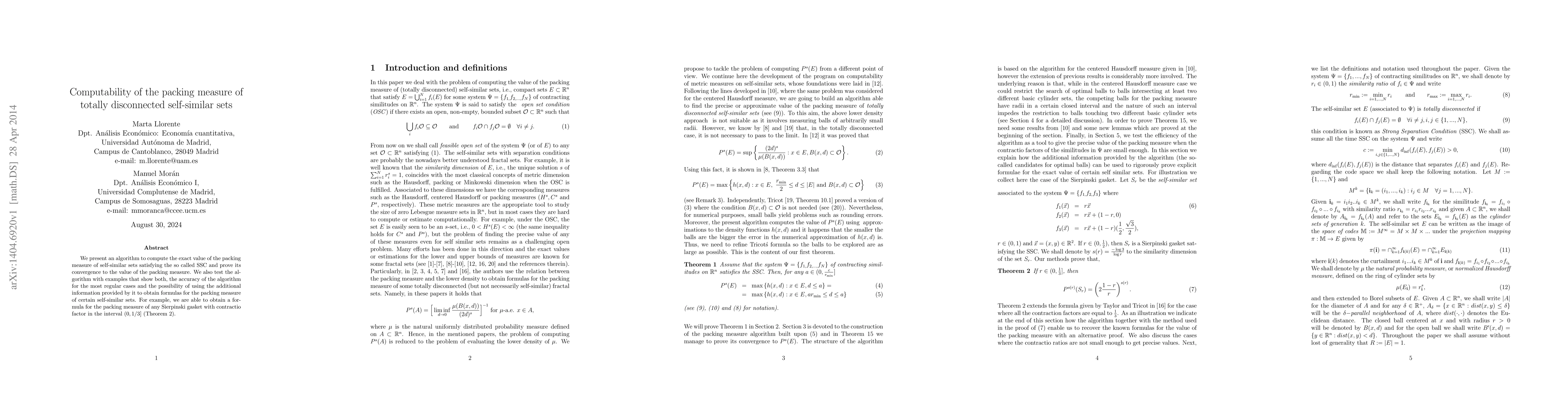 This paper introduces an algorithm to compute the packing measure of totally disconnected self-similar sets, proving its convergence and accuracy. It also provides a formula for the packing measure of Sierpinski gaskets with contraction factors in the interval $(0,1/3]$.