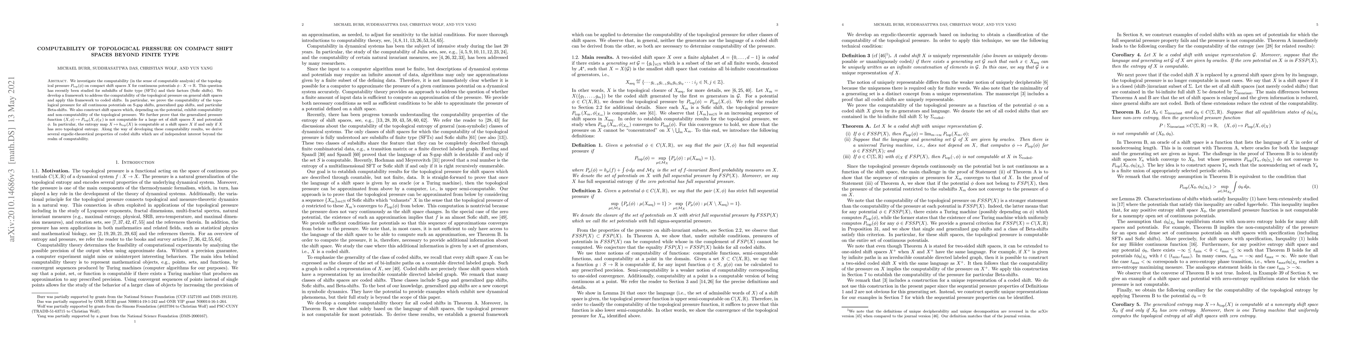 This paper explores the computability of topological pressure on compact shift spaces, extending previous work on subshifts of finite type and sofic shifts. The research introduces a framework for computability on general shift spaces, applying it to coded shifts like S-gap, generalized gap, and Beta-shifts. It proves computability for certain shift spaces and potentials, constructs examples of non-computable cases, and establishes that the entropy map isn't computable for many shift spaces. The study also derives ergodic-theoretical properties of coded shifts, crucial for understanding shift dynamics and computational aspects.