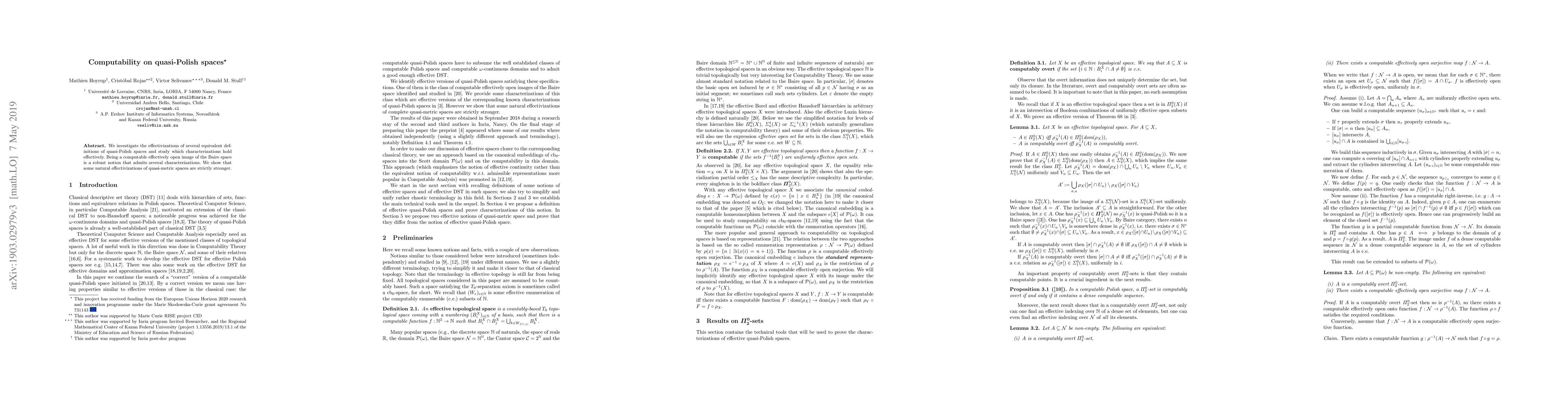 This paper explores effective definitions of quasi-Polish spaces and demonstrates that being a computable effectively open image of the Baire space has robust characterizations, while certain effectivizations of quasi-metric spaces prove to be stronger.