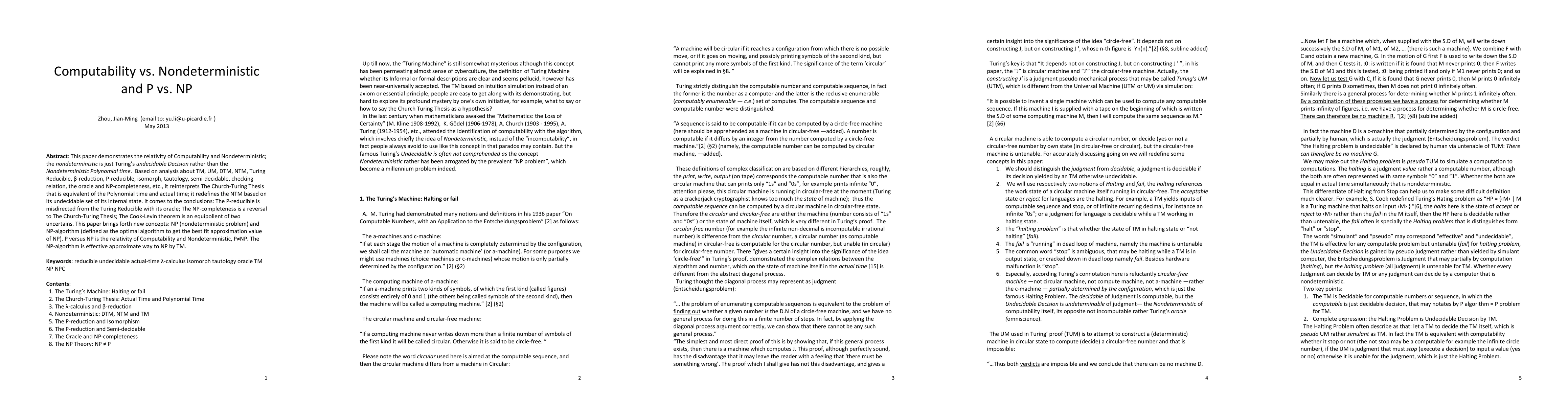 This paper demonstrates the relativity of Computability and Nondeterministic; the nondeterministic is just Turing's undecidable Decision rather than the Nondeterministic Polynomial time. Based on analysis about TM, UM, DTM, NTM, Turing Reducible, beta-reduction, P-reducible, isomorph, tautology, semi-decidable, checking relation, the oracle and NP-completeness, etc., it reinterprets The Church-Turing Thesis that is equivalent of the Polynomial time and actual time; it redefines the NTM based on its undecidable set of its internal state. It comes to the conclusions: The P-reducible is misdirected from the Turing Reducible with its oracle; The NP-completeness is a reversal to The Church-Turing Thesis; The Cook-Levin theorem is an equipollent of two uncertains. This paper brings forth new concepts: NP (nondeterministic problem) and NP-algorithm (defined as the optimal algorithm to get the best fit approximation value of NP). P versus NP is the relativity of Computability and Nondeterministic, P/=NP. The NP-algorithm is effective approximate way to NP by TM.