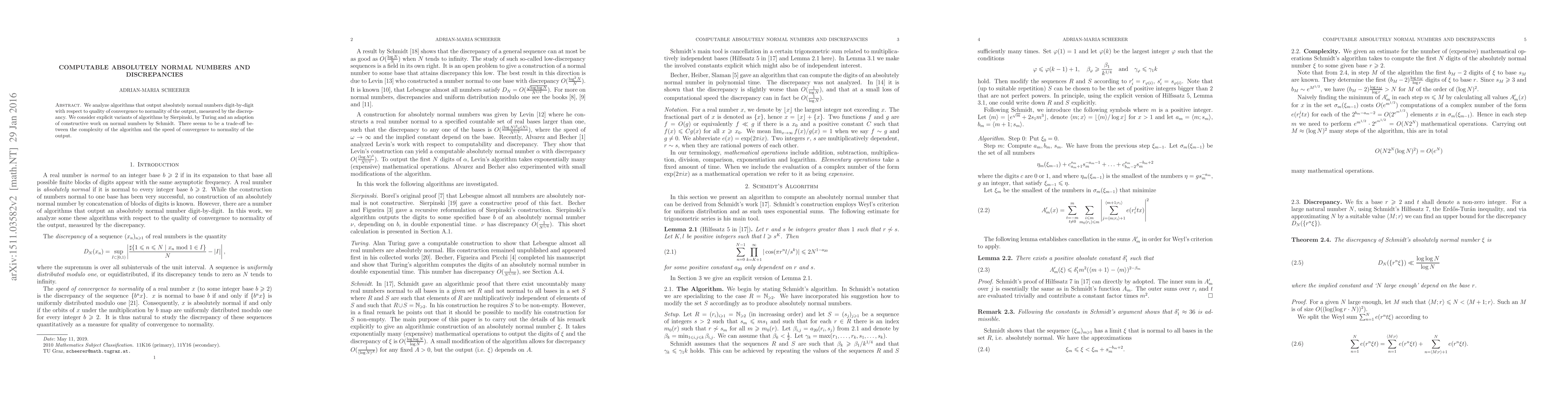 This paper examines algorithms generating absolutely normal numbers, focusing on their convergence quality as measured by discrepancy. It compares Sierpinski's, Turing's, and Schmidt's methods, revealing a trade-off between algorithmic complexity and the rate of convergence to normality.