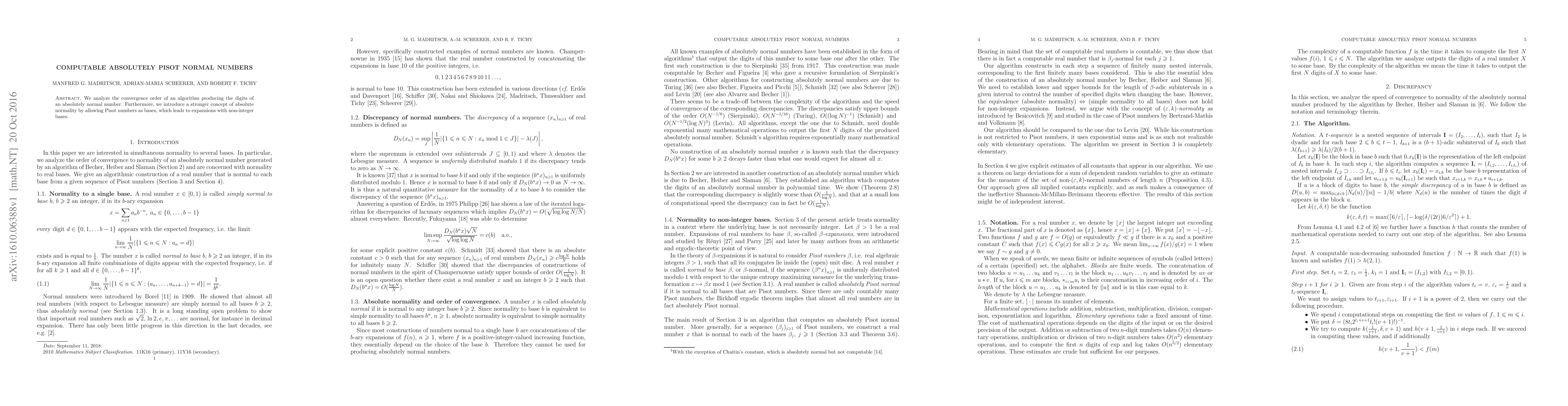 We analyze the convergence order of an algorithm producing the digits of an absolutely normal number. Furthermore, we introduce a stronger concept of absolute normality by allowing Pisot numbers as bases, which leads to expansions with non-integer bases.