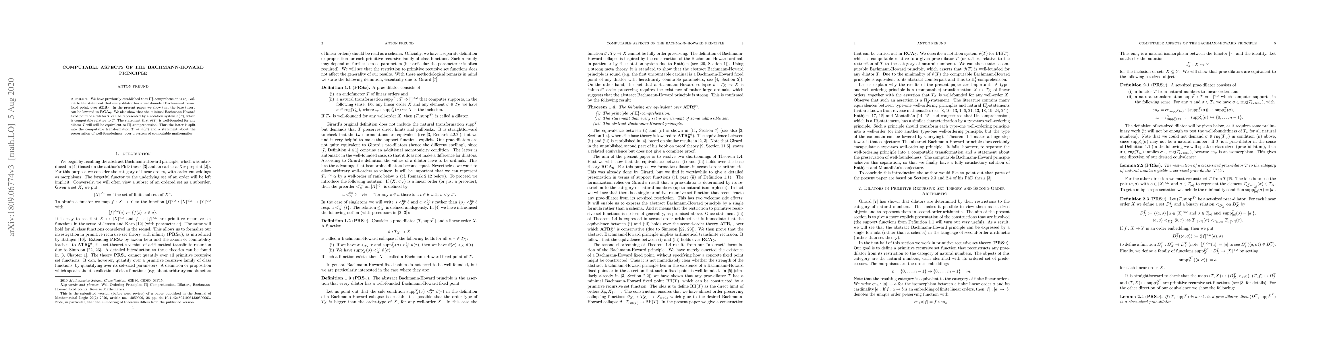 We have previously established that $\Pi^1_1$-comprehension is equivalent to the statement that every dilator has a well-founded Bachmann-Howard fixed point, over $\mathbf{ATR_0}$. In the present paper we show that the base theory can be lowered to $\mathbf{RCA_0}$. We also show that the minimal Bachmann-Howard fixed point of a dilator $T$ can be represented by a notation system $\vartheta(T)$, which is computable relative to $T$. The statement that $\vartheta(T)$ is well-founded for any dilator $T$ will still be equivalent to $\Pi^1_1$-comprehension. Thus the latter is split into the computable transformation $T\mapsto\vartheta(T)$ and a statement about the preservation of well-foundedness, over a system of computable mathematics.