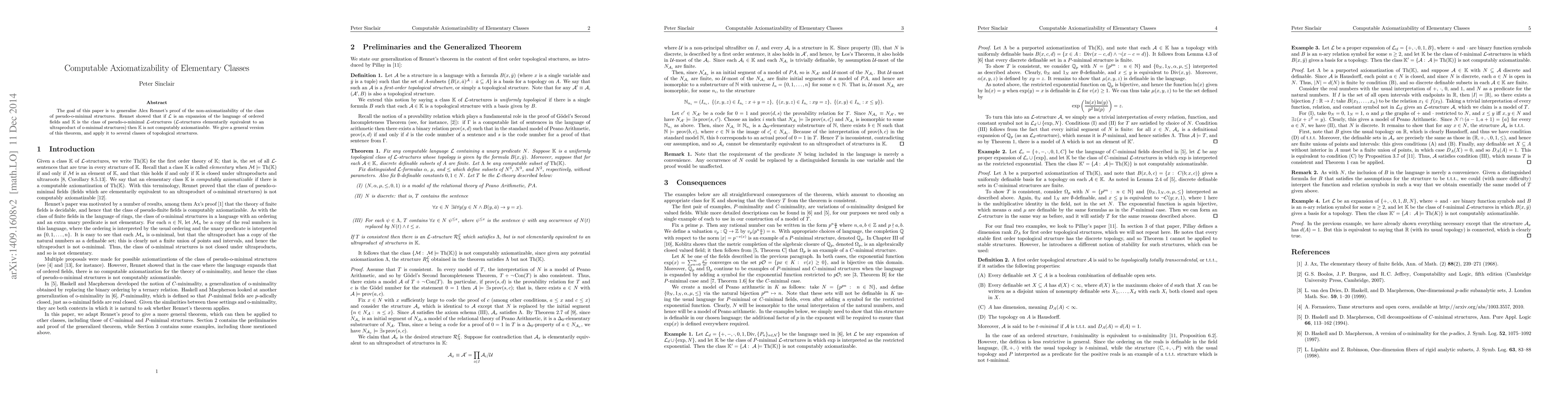 This paper generalizes Alex Rennet's proof of the non-axiomatizability of pseudo-o-minimal structures to broader classes of topological structures, demonstrating that certain elementary classes are not computably axiomatizable.