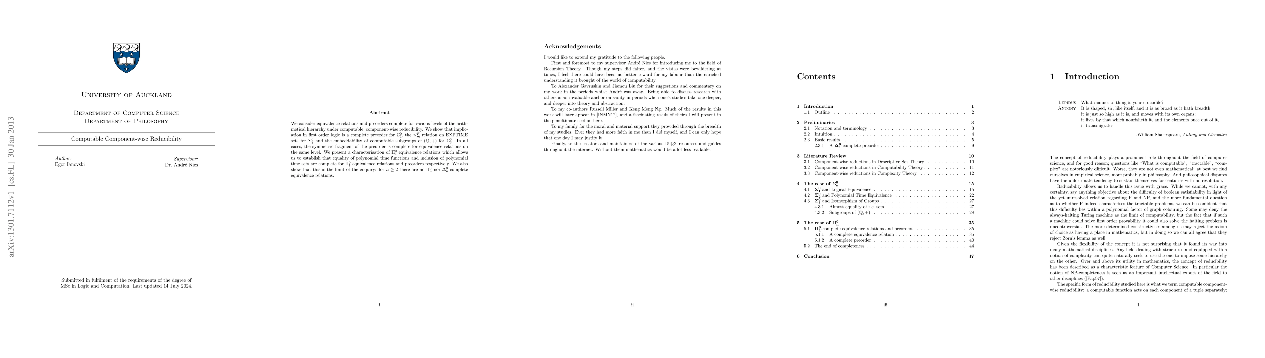 This paper explores computable component-wise reducibility for equivalence relations and preorders within the arithmetical hierarchy, demonstrating that implication in first-order logic is complete for $\SI 1$, $\le^P_m$ for $\SI 2$, and subgroup embeddability for $\SI 3$. It also establishes that equality of polynomial time functions and inclusion of polynomial time sets are complete for $\PI 1$ and concludes that no $\PI n$ or $\DE n$-complete relations exist for $n \geq 2$.