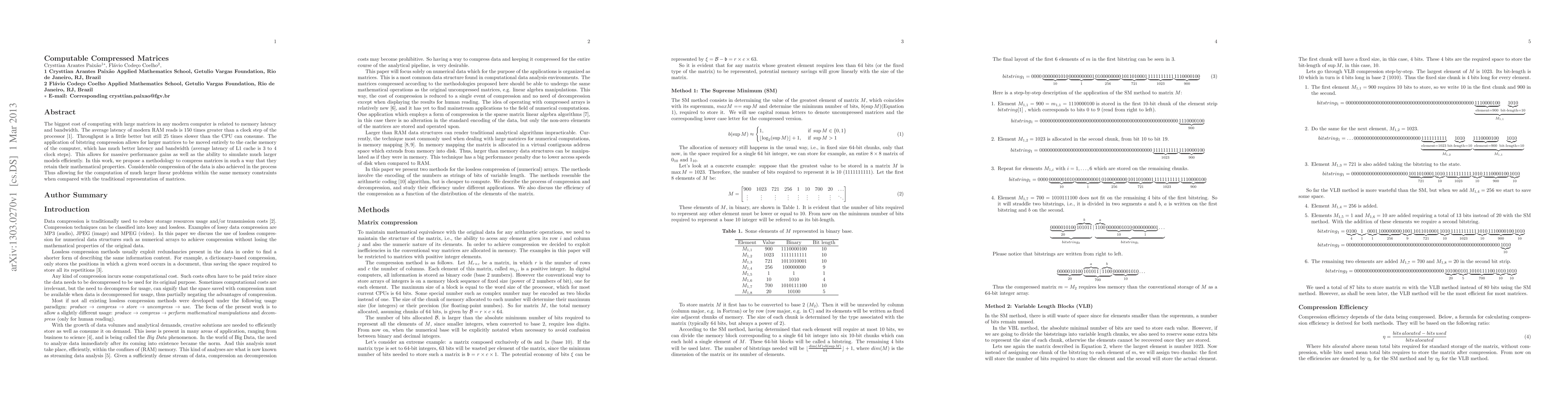 The biggest cost of computing with large matrices in any modern computer is related to memory latency and bandwidth. The average latency of modern RAM reads is 150 times greater than a clock step of the processor. Throughput is a little better but still 25 times slower than the CPU can consume. The application of bitstring compression allows for larger matrices to be moved entirely to the cache memory of the computer, which has much better latency and bandwidth (average latency of L1 cache is 3 to 4 clock steps). This allows for massive performance gains as well as the ability to simulate much larger models efficiently. In this work, we propose a methodology to compress matrices in such a way that they retain their mathematical properties. Considerable compression of the data is also achieved in the process Thus allowing for the computation of much larger linear problems within the same memory constraints when compared with the traditional representation of matrices.