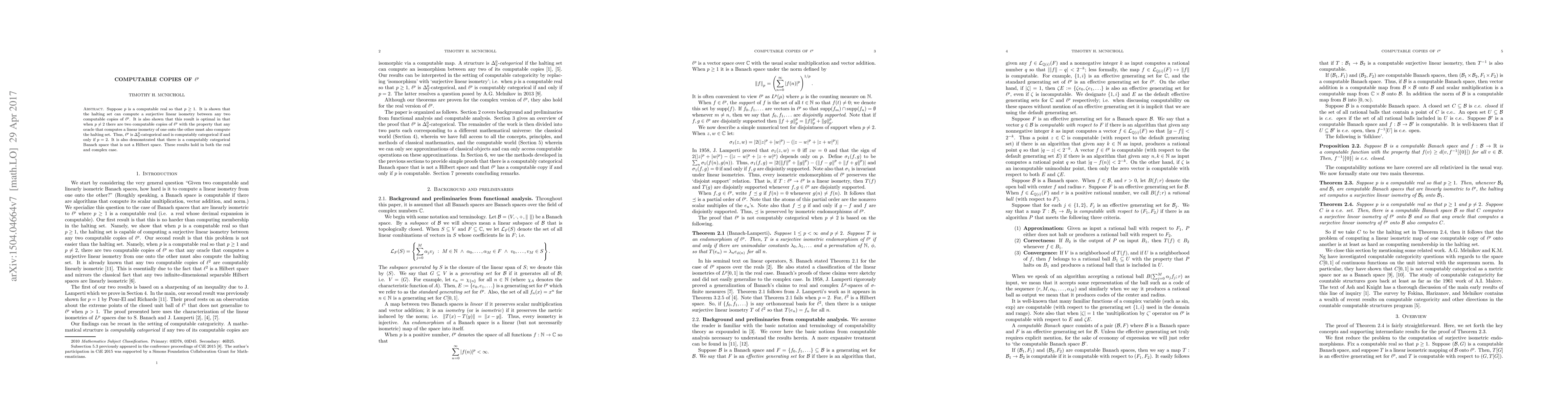 \begin{abstract} Suppose $p$ is a computable real so that $p \geq 1$. It is shown that the halting set can compute a surjective linear isometry between any two computable copies of $\ell^p$. It is also shown that this result is optimal in that when $p \neq 2$ there are two computable copies of $\ell^p$ with the property that any oracle that computes a linear isometry of one onto the other must also compute the halting set. Thus, $\ell^p$ is $\Delta_2^0$-categorical and is computably categorical if and only if $p = 2$. It is also shown that there is a computably categorical Banach space that is not a Hilbert space and that $\ell^p$ is linearly isometric to a computable Banach space if and only if $p$ is computable. These results hold in both the real and complex case.